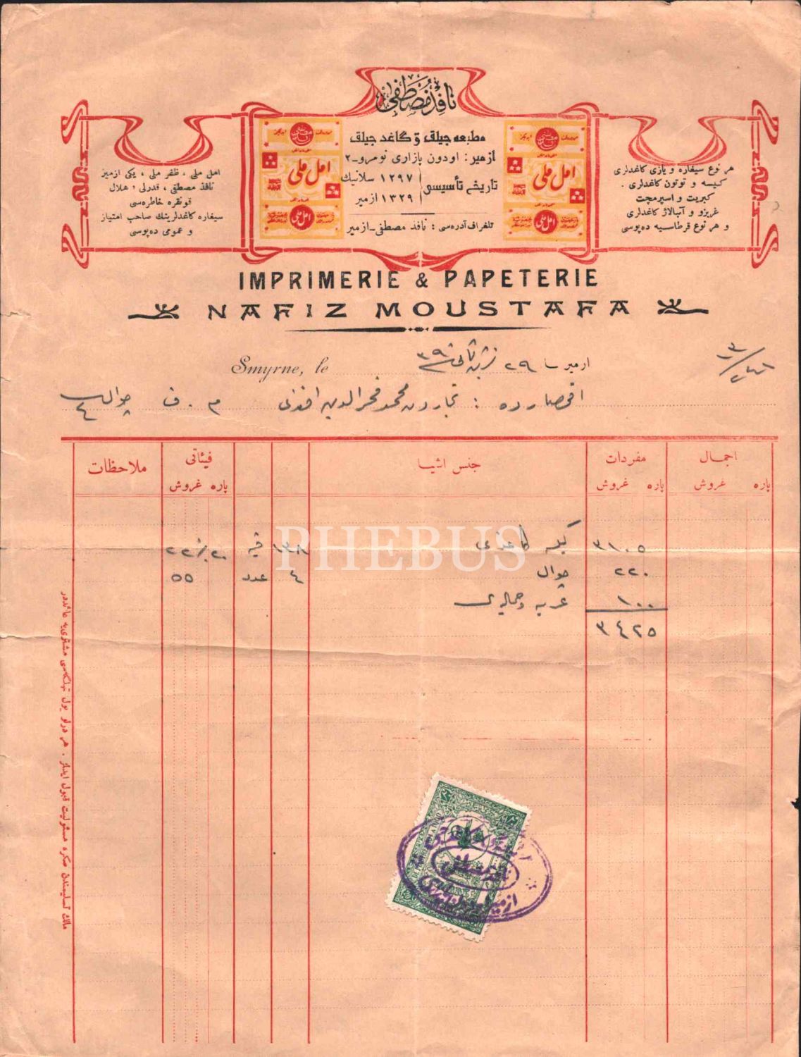 Osmanlıca-Fransızca Nafiz Mustafa Matbaacılık ve Kâğıdçılık- Emel-i Milli" antetli fatura, İzmir [Smyrne] 1339, 21x29 cm
