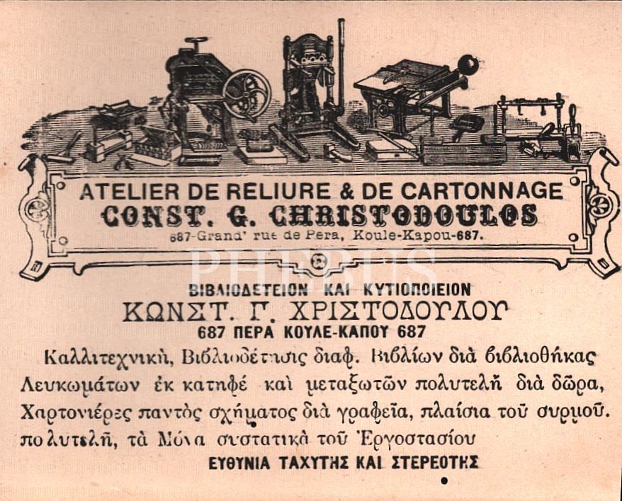 Const. G. Christodoulos Karton ve Cilt Atölyesi´ne ait Rumca-Fransızca işyeri kartı, Pera, 9x12 cm