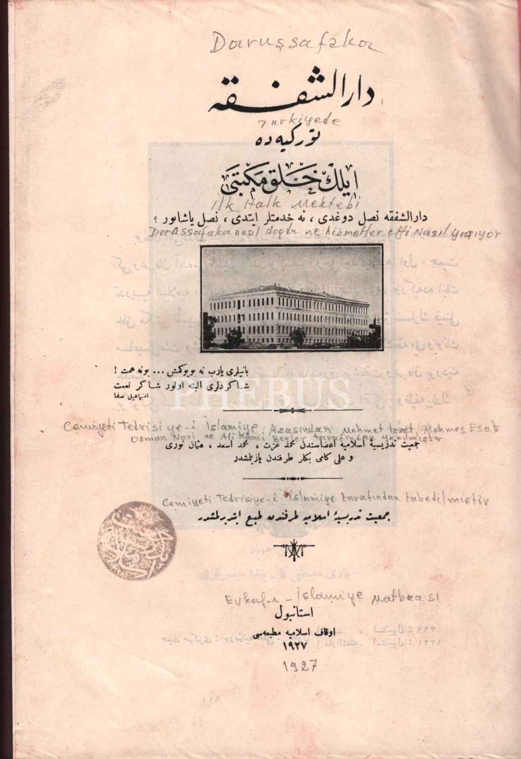 DARÜŞŞAFAKA (Türkiye´de İlk Halk Mektebi), Evkaf-ı İslamiye Matbaası, İstanbul 1927, 207 s., 20x28 cm