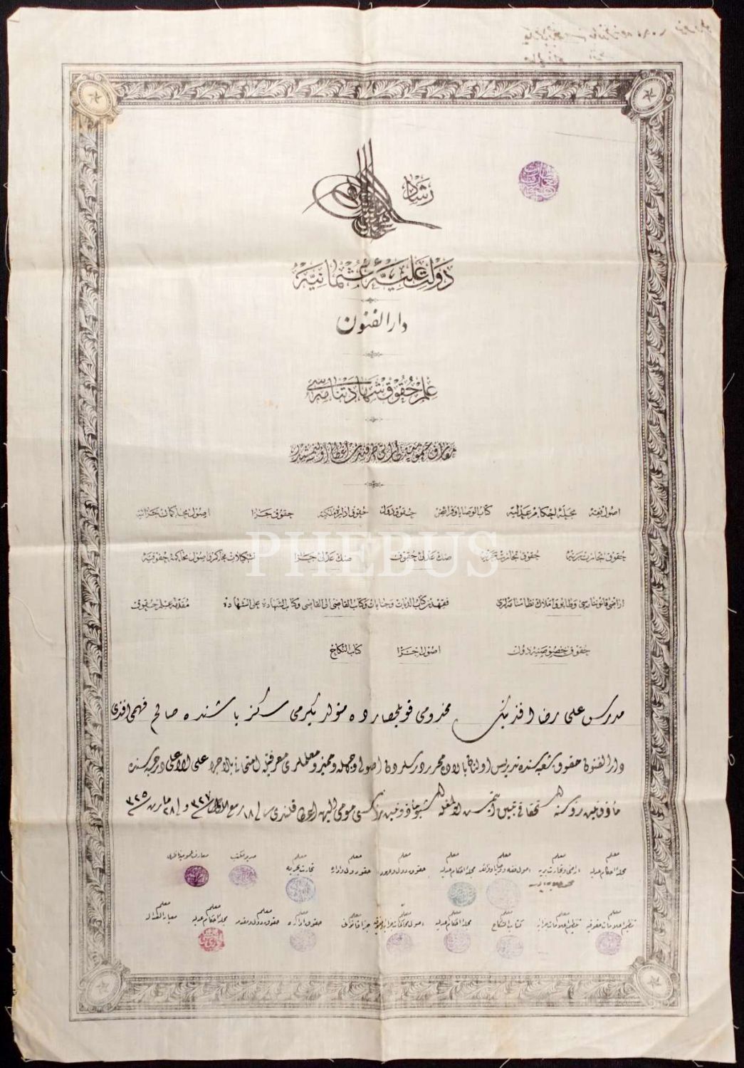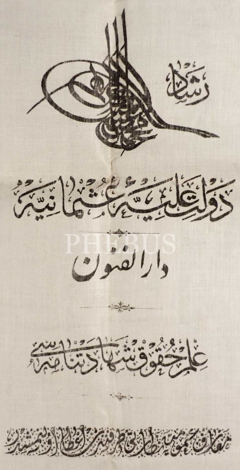 Sultan Reşad dönemine ait bez diplomada hukuk muallimleri ve Maarif Nazırı Emrullah Efendi'nin damgası bulunmaktadır.