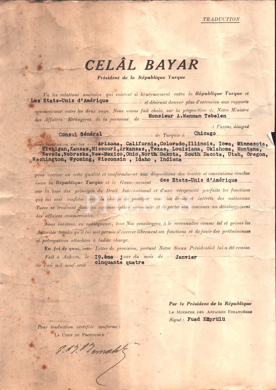 Cumhurbaşkanı Celal Bayar´ın ABD ziyareti programına ilişkin Fransızca evrak, 23x32 cm