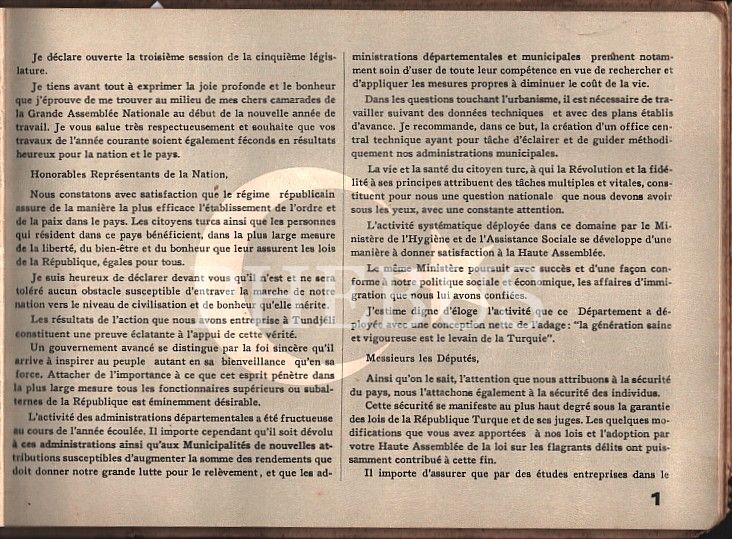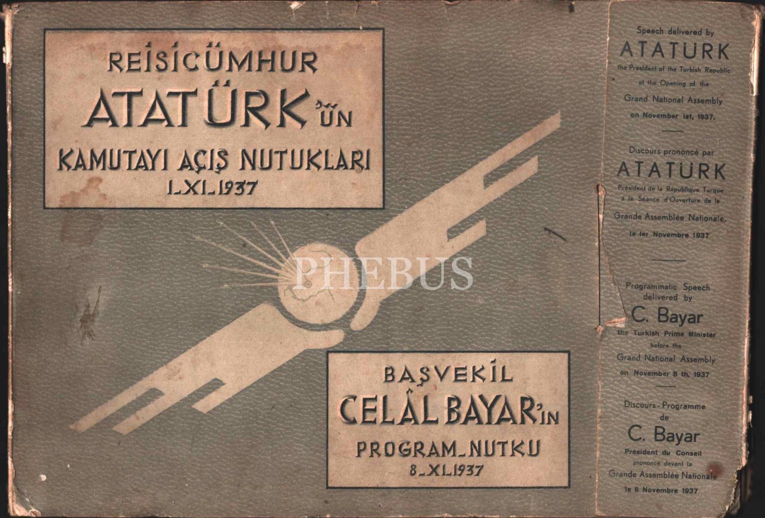 Türkçe-İngilizce-Fransızca REİSİCUMHUR ATATÜRK´ÜN KAMUTAYI AÇIŞ NUTUKLARI- BAŞVEKİL CELÂL BAYAR´IN PROGRAM NUTKU (1937), 35+22+48 s., 18x25 cm