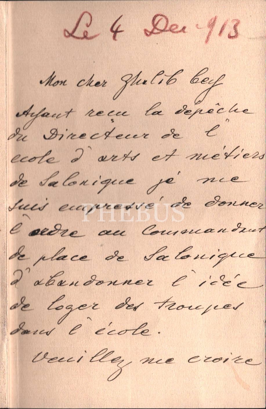 Selanik Sanat Meslek Okulu Müdürü´nden aldığım bir rapor üzerine Selanik müstahkem mevki komutanına acele yazarak, okula askerlerini yerleştirme fikrinden vazgeçmesini emrettim… E.K. Venizelos"