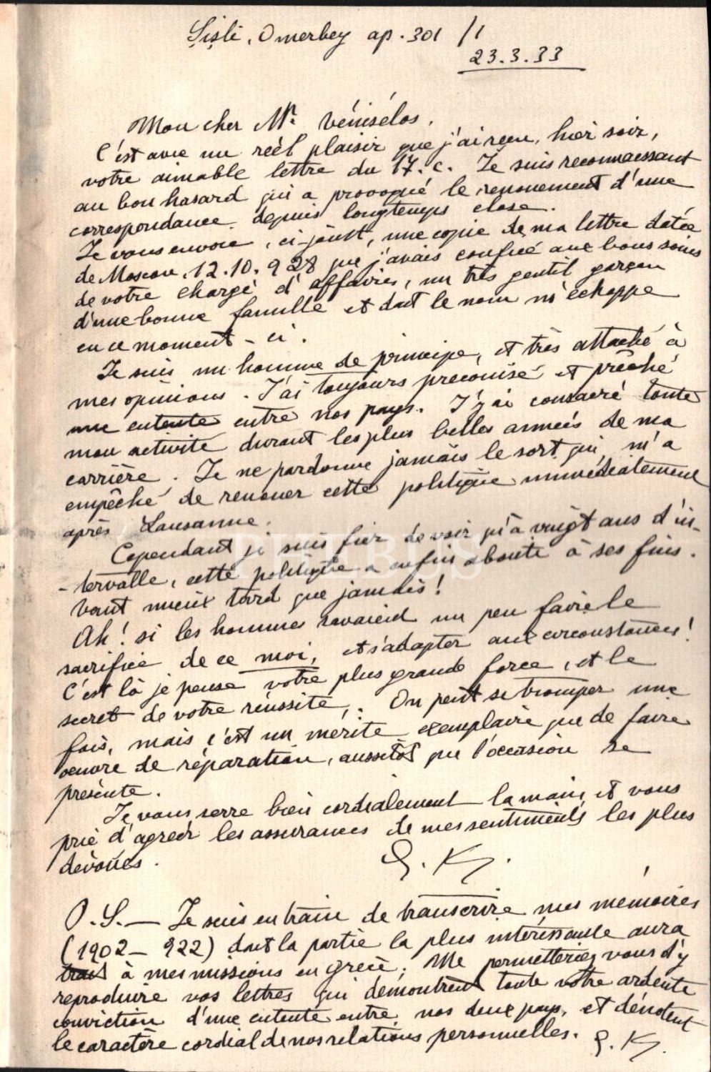 Not: Halen anılarımı yazıyorum (902-922); en ilginç kısım Yunanistan´daki görevlerimle ilgili olacak; ülkelerimiz arasındaki dostluk hakkındaki inancınızı belirten ve aramızdaki kişisel dostluğu vurgulayan bazı mektuplarınızı kullanmama izin verir miydiniz? G. K."