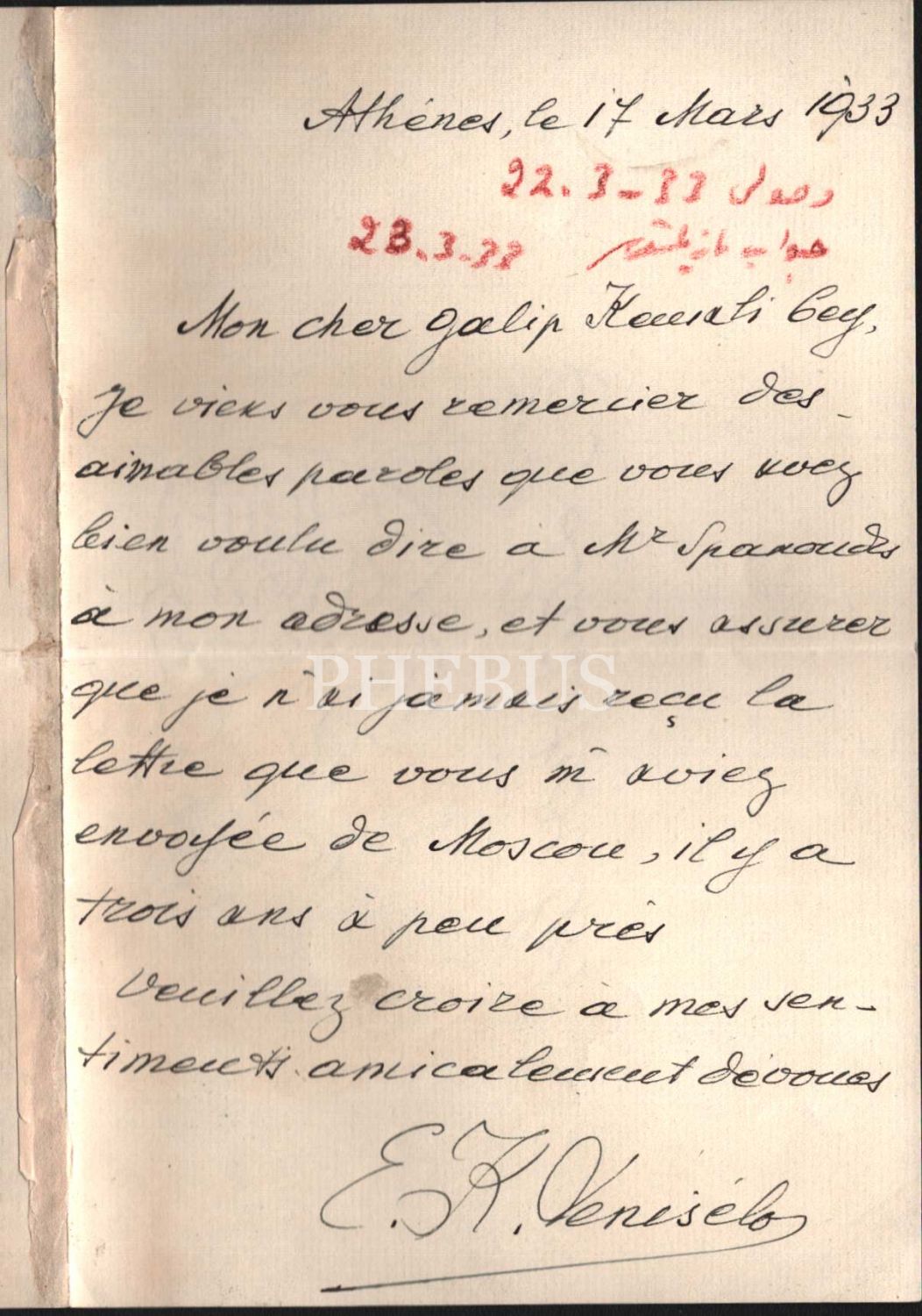 Diplomat Galib Kemali Söylemezoğlu´nun E. Kyriakos Venizelos´a gönderdiği 1933 tarihli Fransızca mektup, 14x22 cm