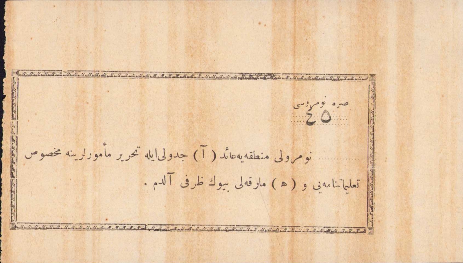 Osmanlıca, 45 numaralı mıntıkaya ait 'A' cetveli ile tahrir memurlarına mahsus talimatnameyi ve 'H' markalı büyük zarfı aldım, 14x8 cm