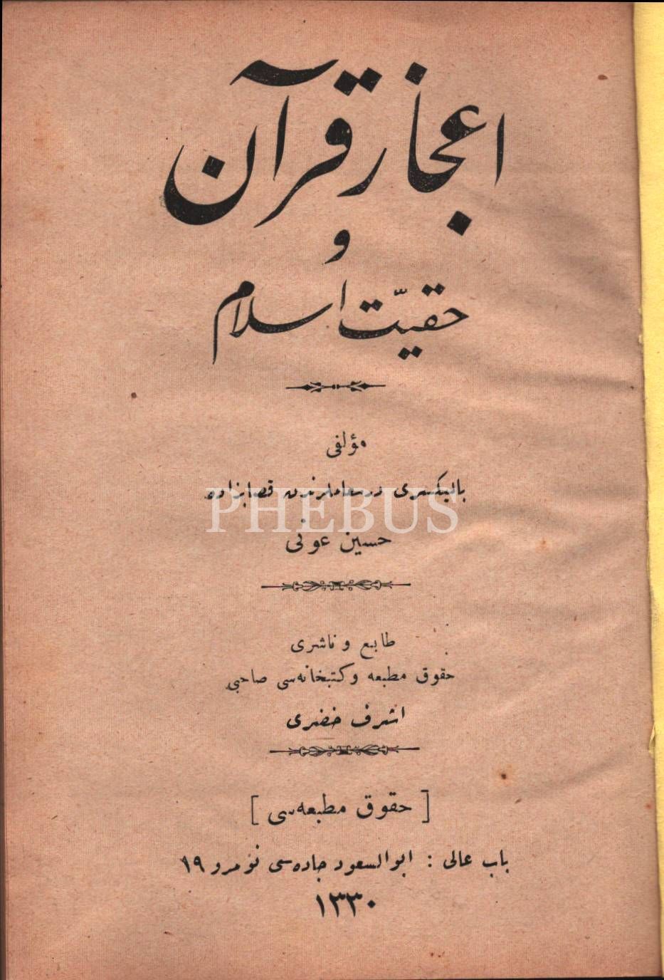 İ´CÂZÜ KUR´ÂN VE HAKKİYET-İ İSLÂM, Hüseyin Avni, Hukuk Matbaası, 1330, 48 s., 13x18 cm
