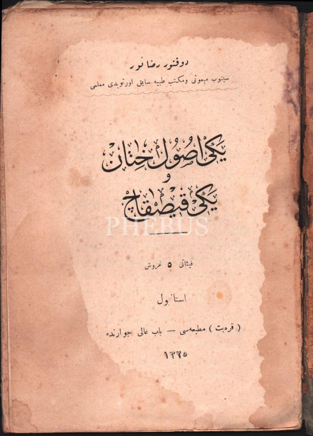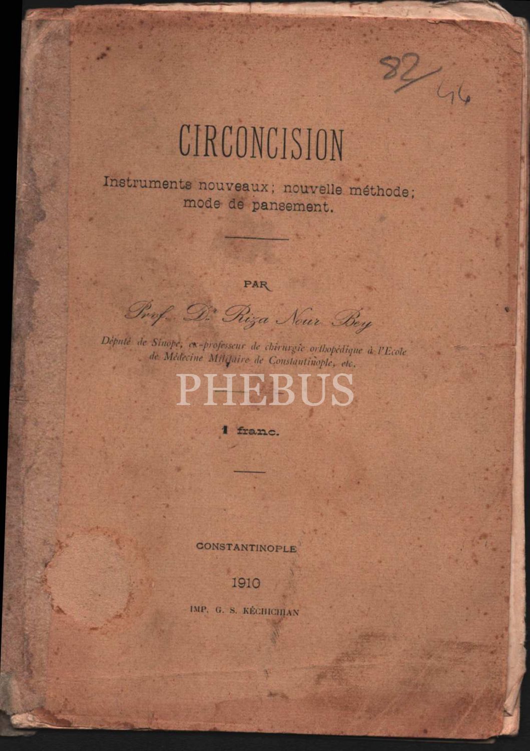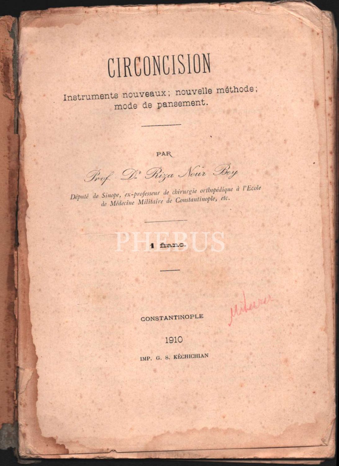 Tıp tarihi: Osmanlıca-Fransızca YENİ USÛL HITÂN VE YENİ KISKAÇ [Sünnet], Dr. Rıza Nur, Karabet Matbaası, İstanbul 1910, 19+10 s., 14x20 cm
