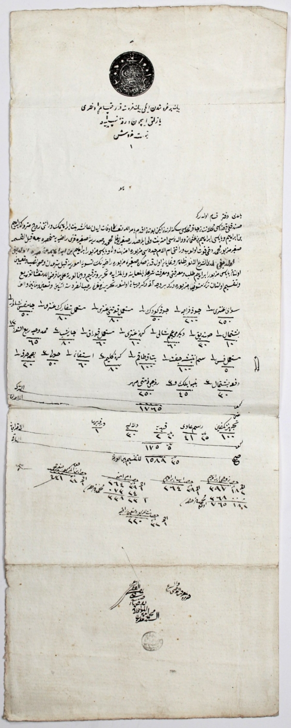 Kadı Esseyyid Ali Mehmet Efendi mühürlü, 1291 tarihli 20x50 cm, tereke: Osmanlı miras hukukunda ölen kişilerin geride bıraktığı mallar için kullanılan terim.