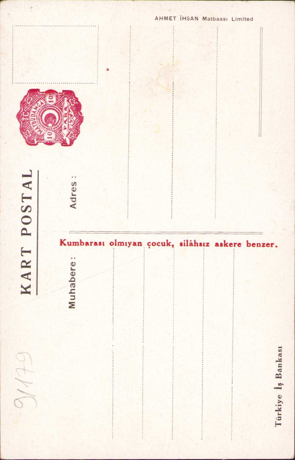 Türkiye İş Bankası reklamlı kart, "kumbarası olmayan çocuk, silahsız askere benzer", Ahmet İhsan Matbaası Limited
