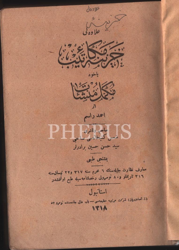 Edebiyat tarihi: İLÂVELİ HAZÎNE-İ MEKÂTİB YÂHÛD MÜKEMMEL MÜNŞEÂT, Ahmed Rasim, A. Asaduryan Şirket-i Mürettibiye Matbaası, İstanbul 1318, 416 s., 14x20 cm