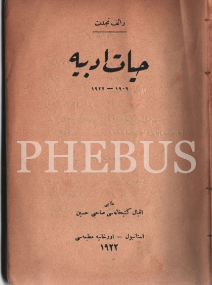 Edebiyat tarihi: HAYÂT-I EDEBİYYE, Raif Necdet, yazarından ithaf-imzalı, Orhaniye Matbaası, İstanbul 1922, 383 s., 14x20 cm, sırtı ayrık haliyle