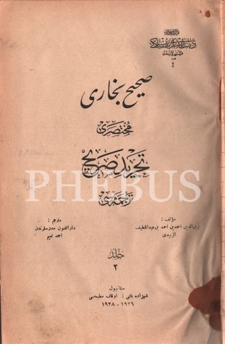 SAHÎH-İ BUHÂRÎ MUHTASARI- TECRÎD-İ SARÎH TERCÜMESİ (1 ve 2. Cilt), Zeyneddin Ahmed ez-Zebidî, çev. Ahmed Naim, Evkâf Matbaası, İstanbul 1928, 495+766 s., 16x25 cm
