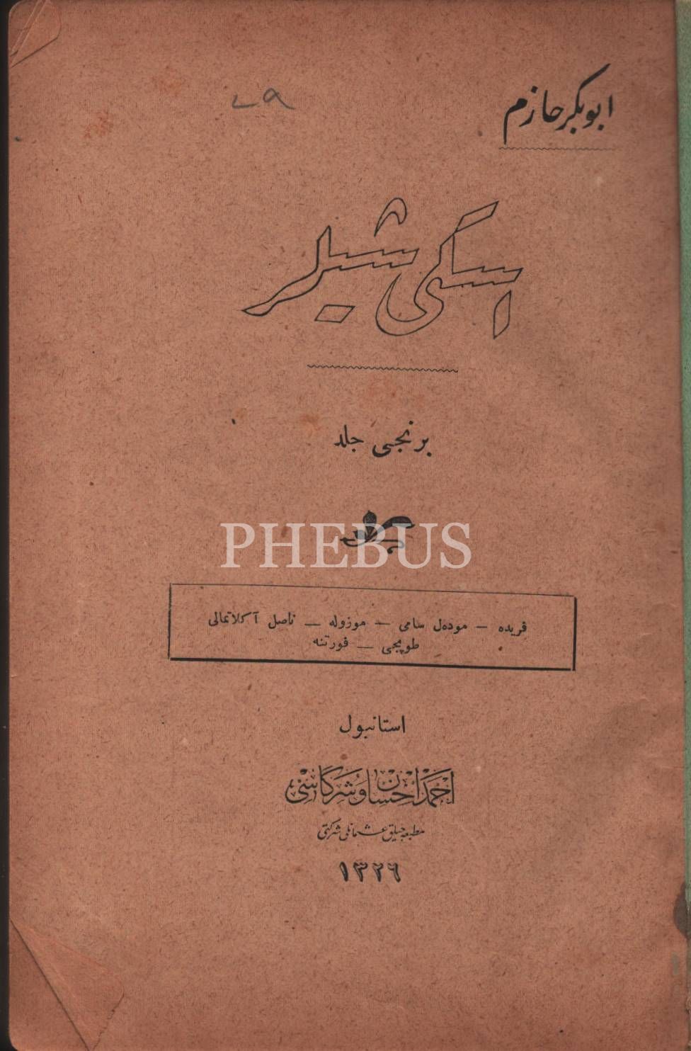 Edebiyat tarihi: ESKİ ŞEYLER (1. Cilt), Ebubekir Hâzım, Ahmed İhsan ve Şürekası Matbaacılık Osmanlı Şirketi, İstanbul 1326, 238 s., 13x19 cm