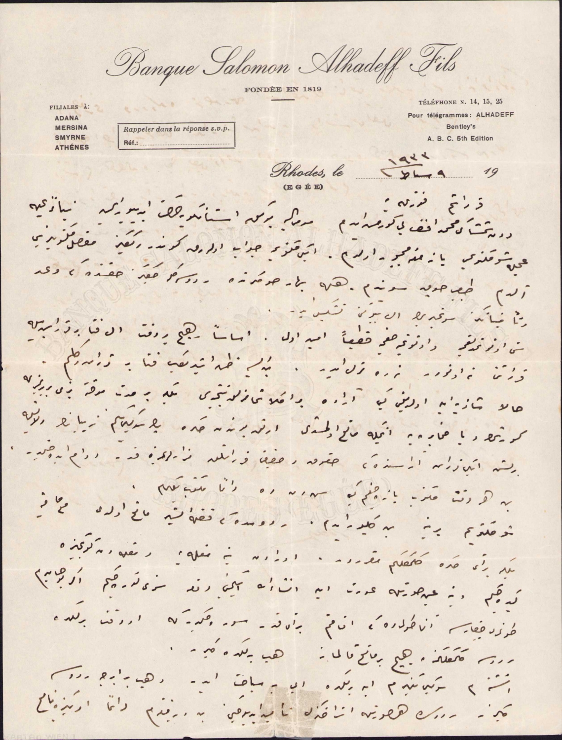 Banque Salamon Alhadeff Fils - 1819 antetli doküman, Osmanlıca yazılı - 1933 tarihli, 21x28 cm