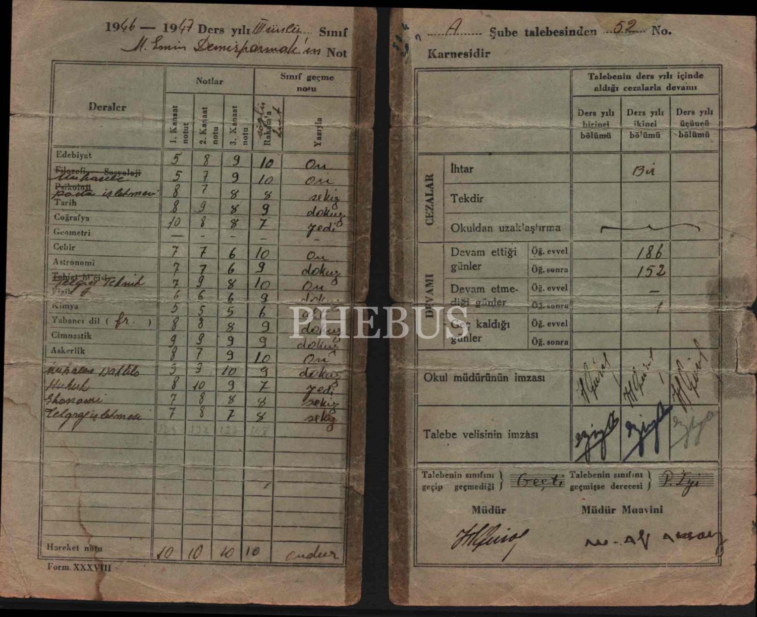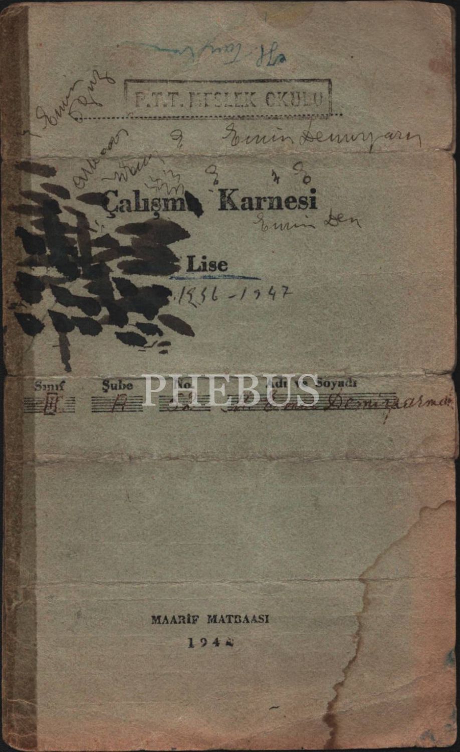 Eğitim tarihi: PTT Meslek Okulu 1946-47 eğitim yılı karnesi, 19x23 cm, ortadan ayrık haliyle