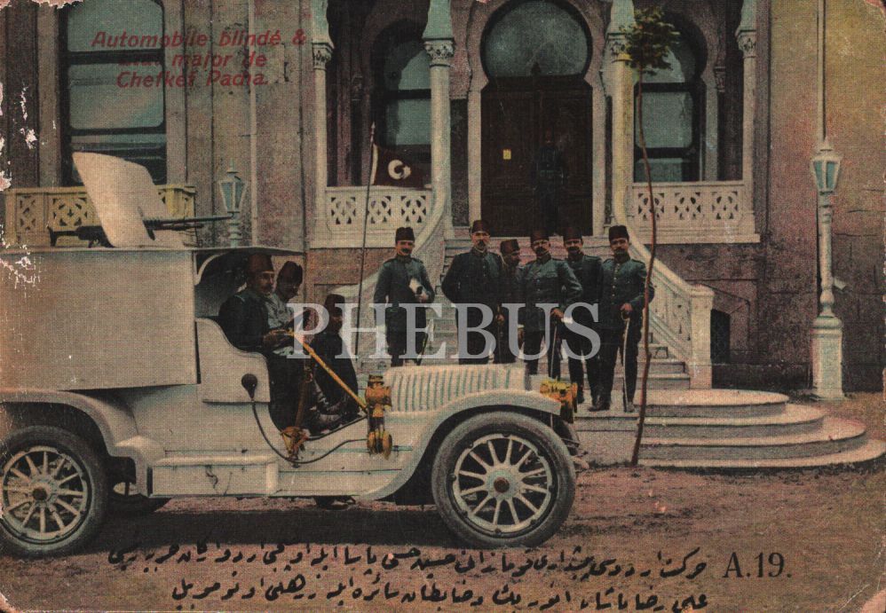 Kumandan Hüseyin Hüsnü Paşa, Ali Rıza Paşa, Enver Bey vs. subaylar ve zırhlı otomobil, ed. Max Fruchtermann, Constantinople