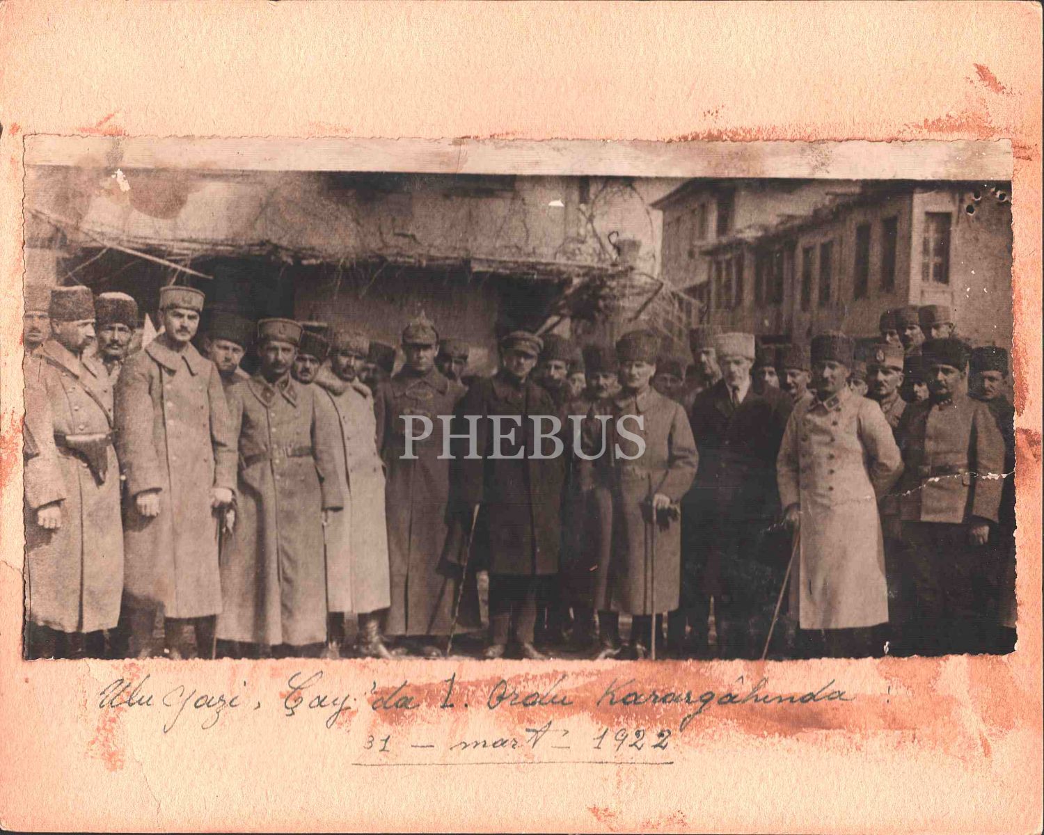 "Ulu Gazi" Atatürk´ün I. Ordu Karargâhında topluluk içerisinde çektirdiği büyük boy hatıra fotoğrafı, 1922 tarihli, ikinci baskı, paspartu: 24x30 cm