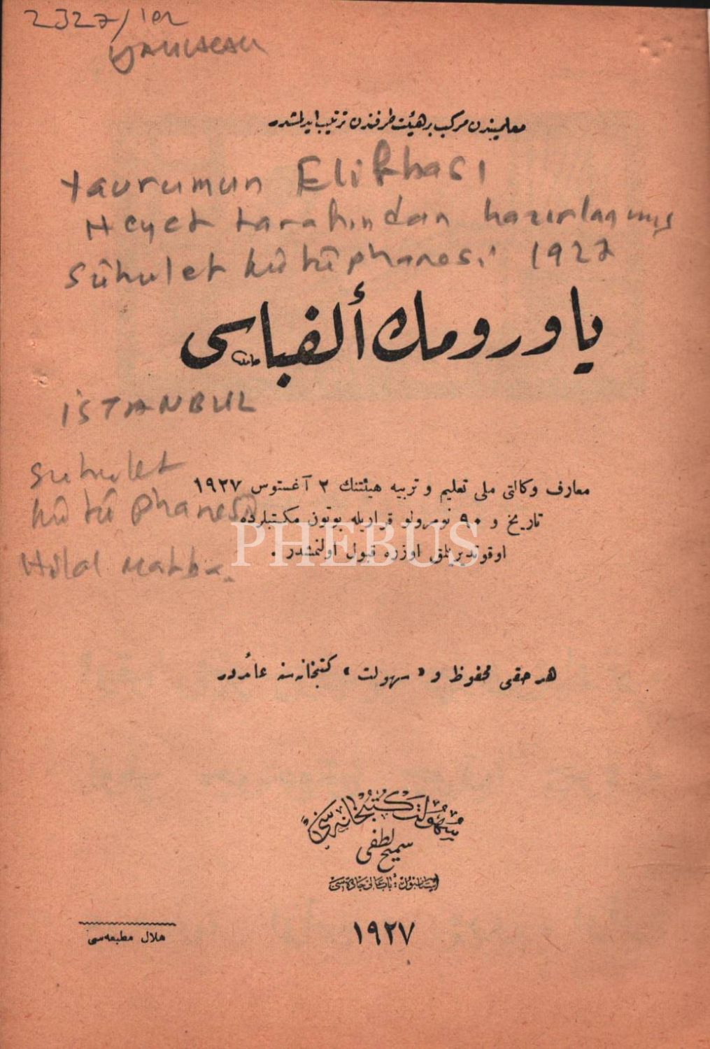 Eğitim tarihi: YAVRUMUN ELİFBÂSI, Hilal Matbaası, İstanbul 1927, 63 s., 14x20 cm