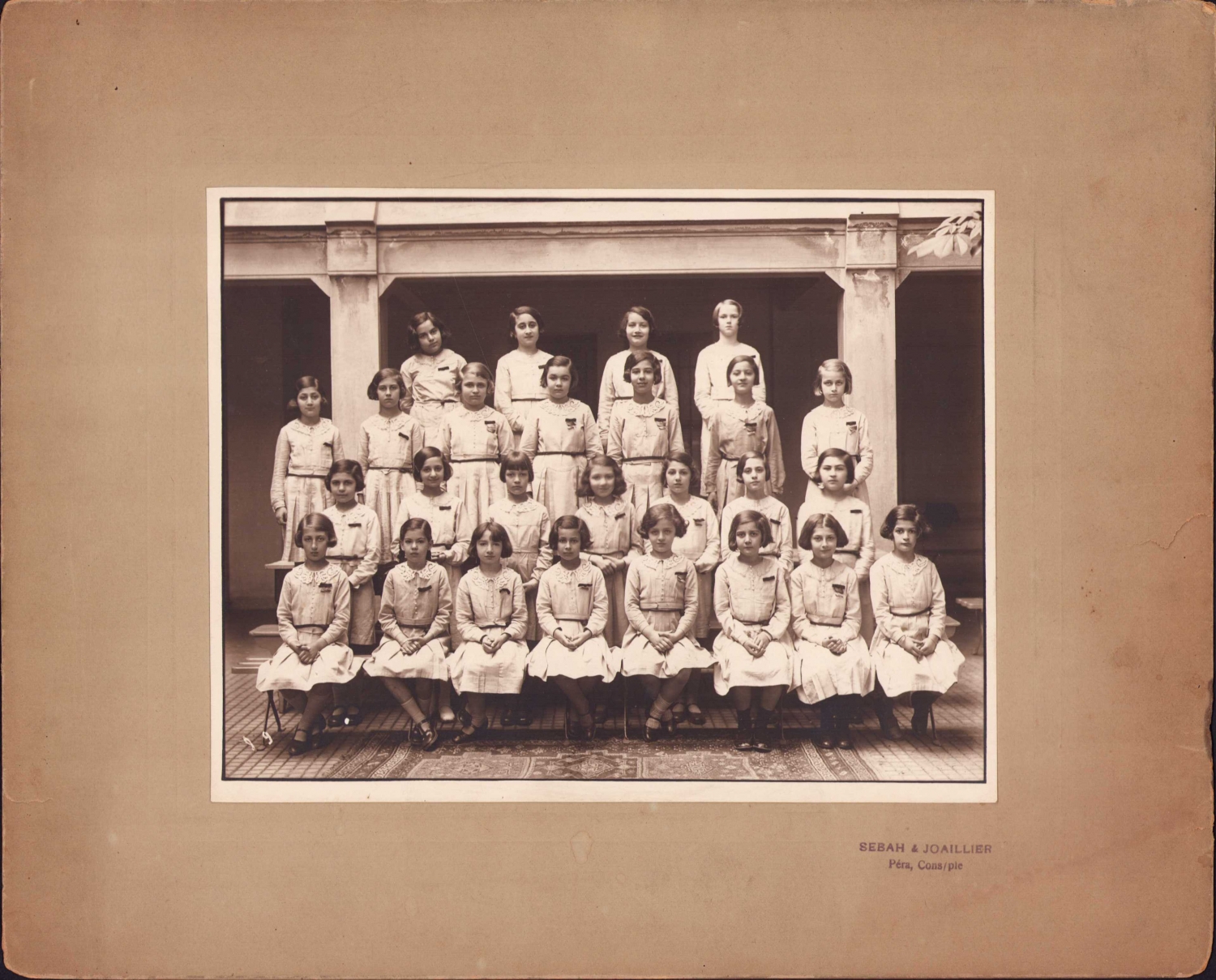 1933 Fransız okulu, yakalarına kurdela takmış kız öğrenciler topu halde, bir kenarı kırık, 34x27 cm