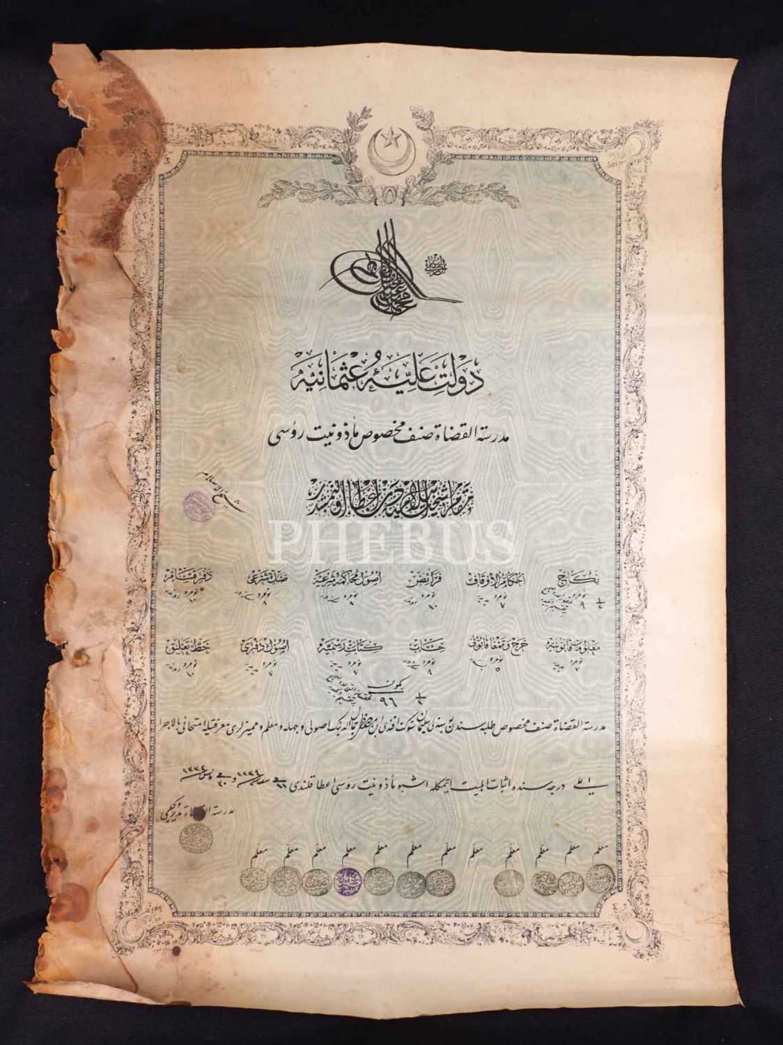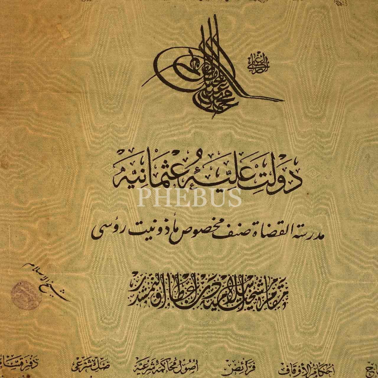 Eğitim tarihi: Medresetü´l-Kuzat Sınıf-ı Mahsus diploması, 1334 tarihli, 36x51 cm