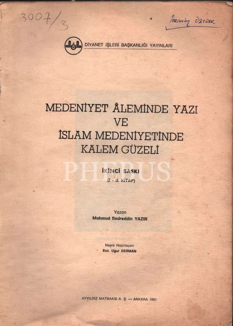 MEDENİYET ÂLEMİNDE YAZI VE İSLÂM MEDENİYETİNDE KALEM GÜZELİ, Mahmud Bedrettin Yazır, (1 ve 2. Kitap), Ayyıldız Matbaası, Ankara 1961, 272 sayfa, 20x28 cm