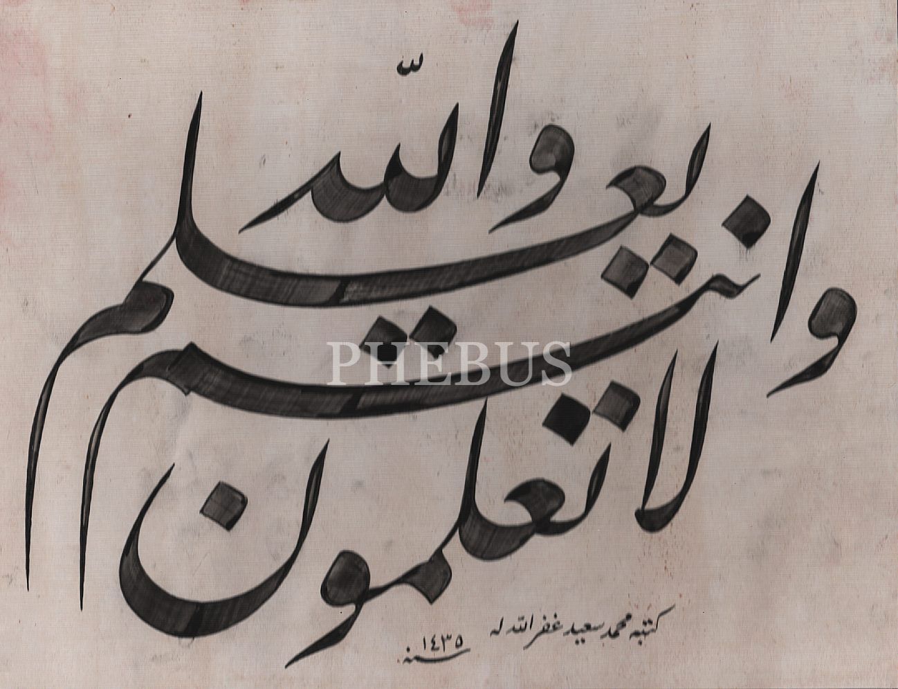 Mehmed Said ketebeli ve 1435 tarihli celî ta´lik ayet: "Allah bilir, siz bilmezsiniz" (Âl-i İmran/66), ebru pervazlı, 26x34 cm
