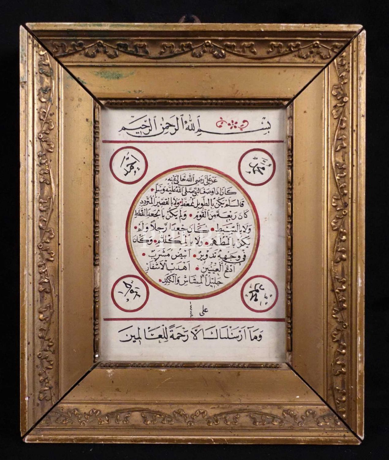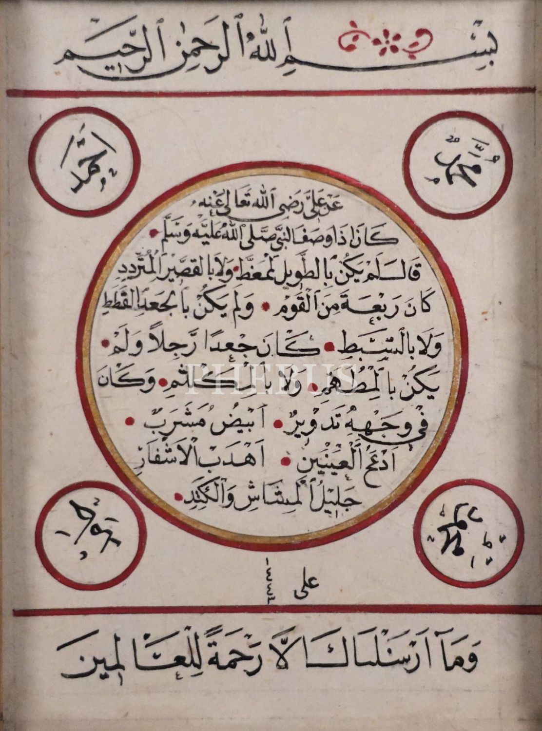 Ahşap çerçeve içinde Ali ketebeli, 1443 tarihli nesih hilye-i şerîf, 18x22 cm