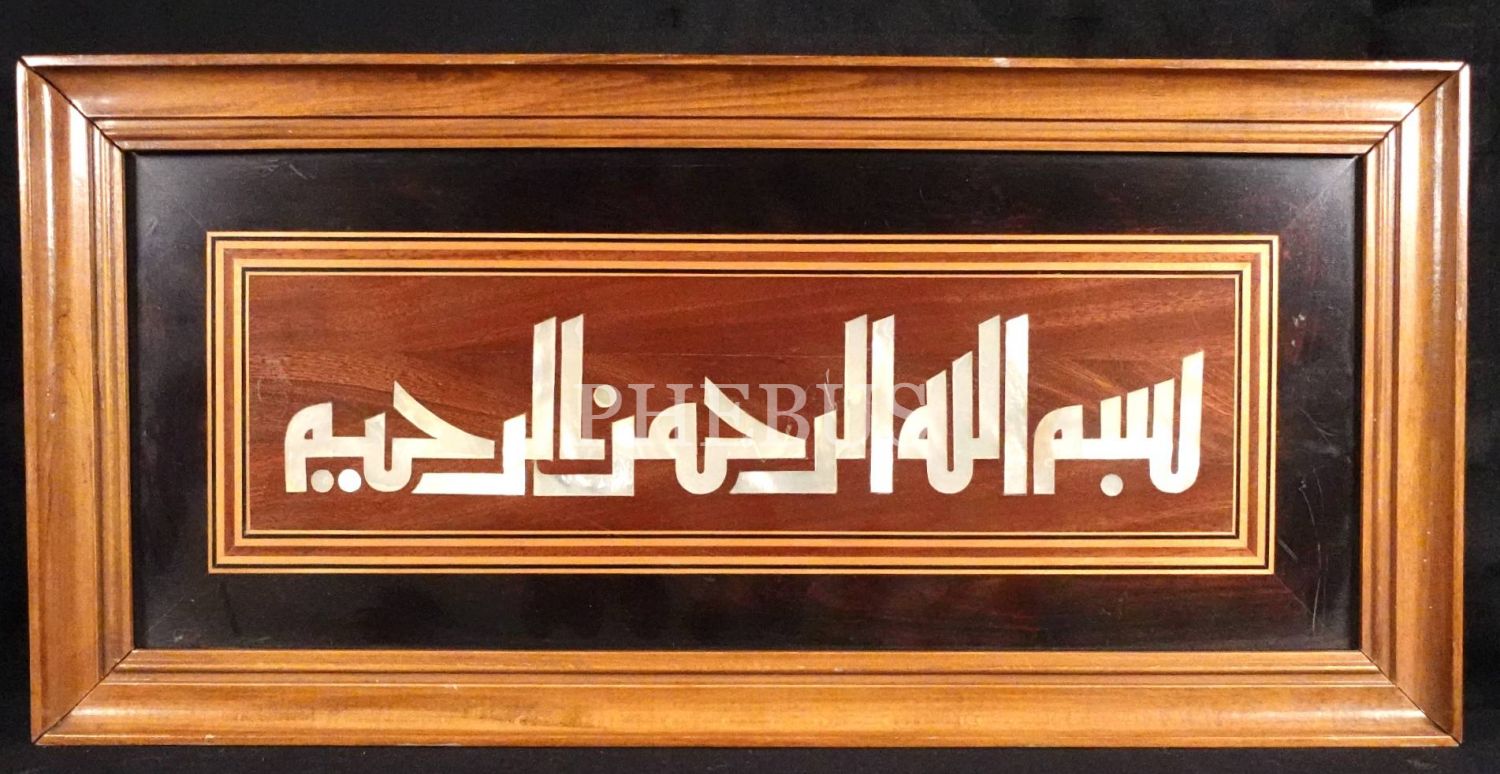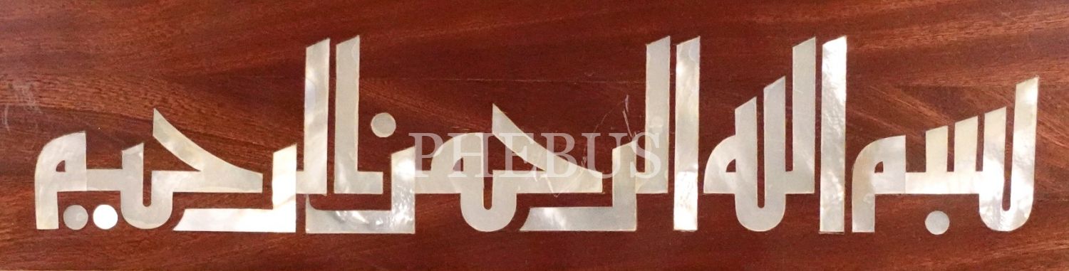 Salih Balakbabalar ustalığıyla ahşap üzeri sedef kakma kûfi besmele, 27x57 cm