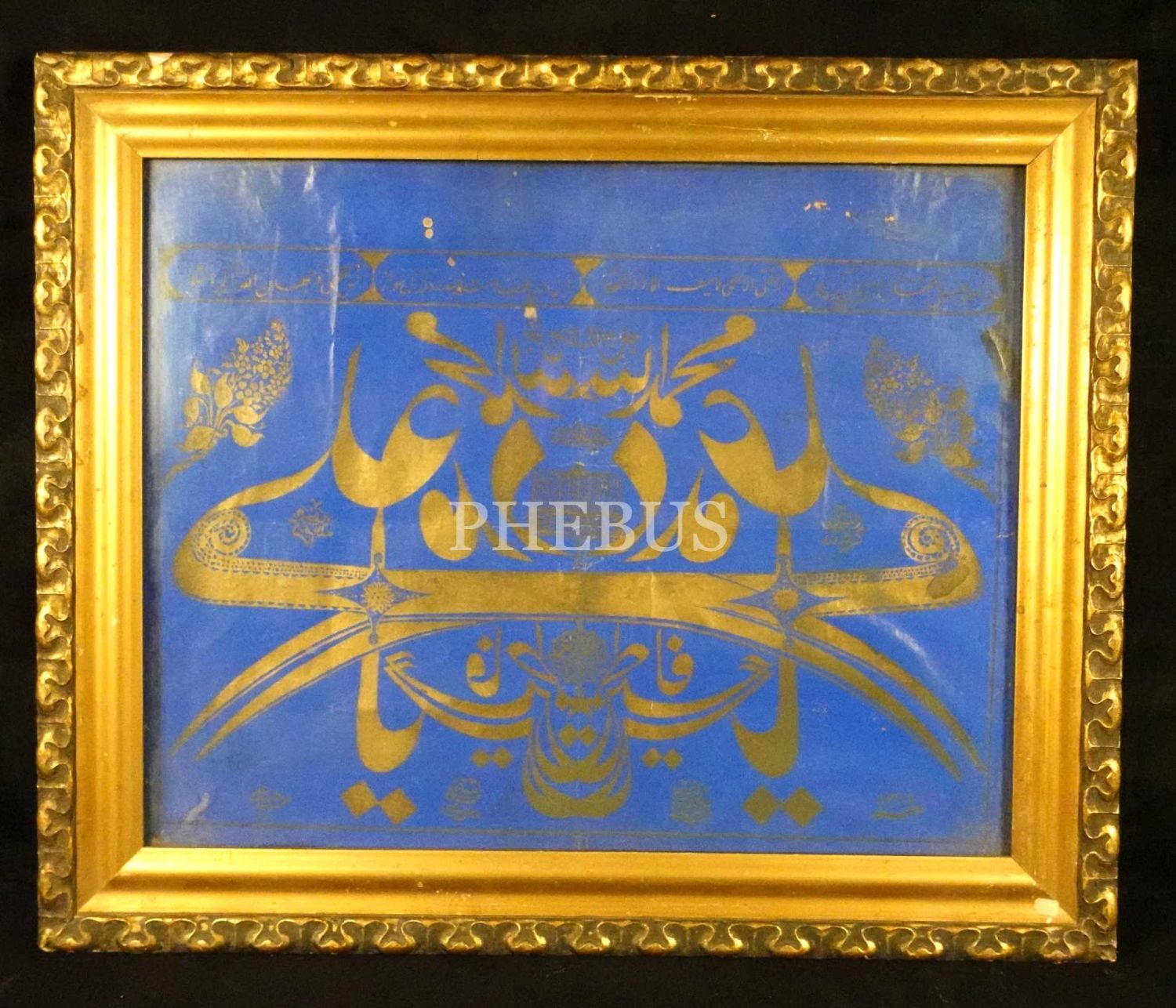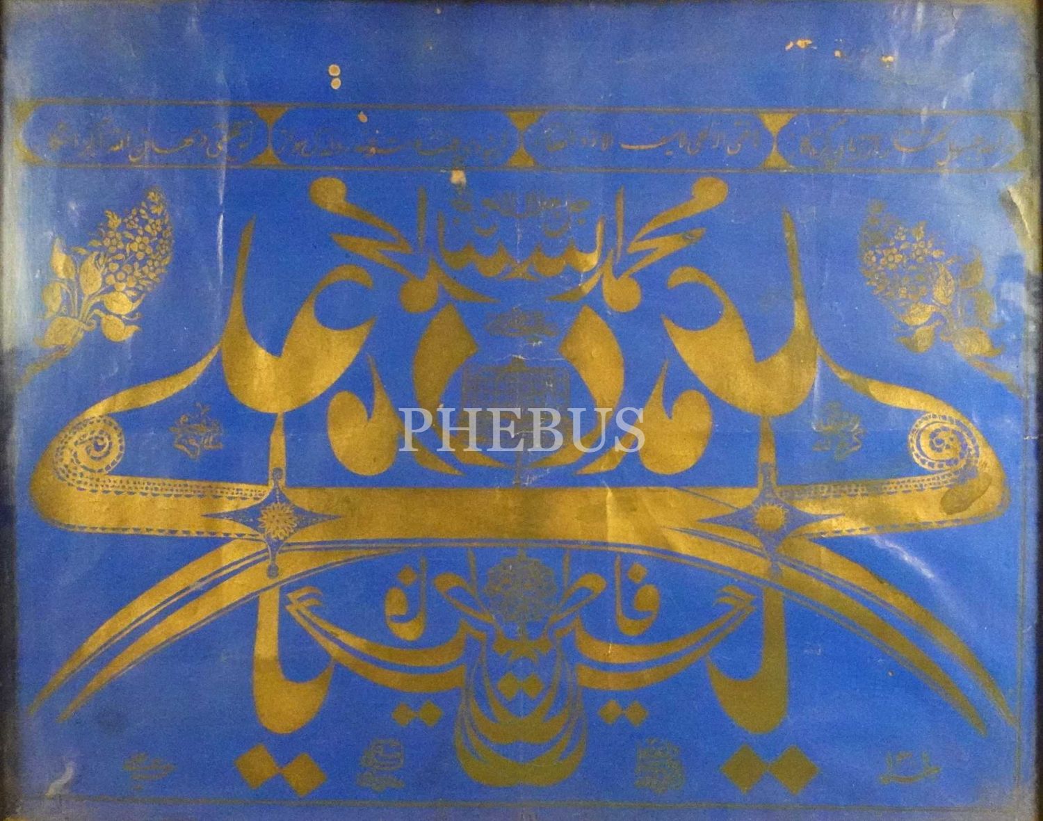 Tekke işi müsenna yazı ile Lafzatullah, Âl-i abâ ve Hz. Ali´ye övgüler, özgün baskı yazı, ahşap çerçeveli, 44x53 cm