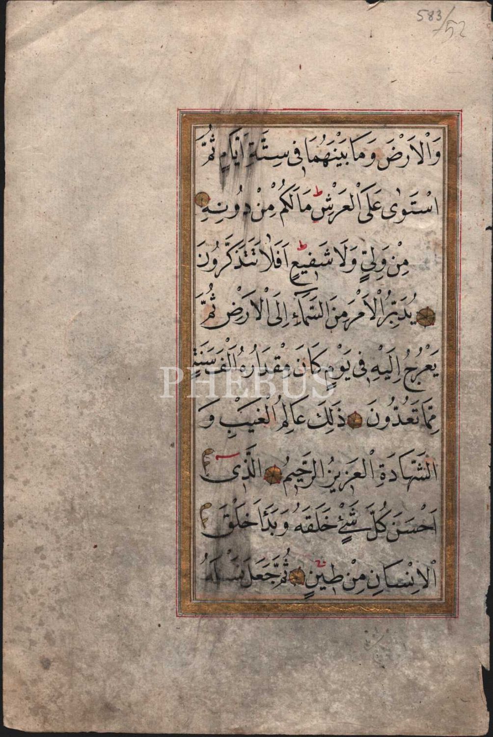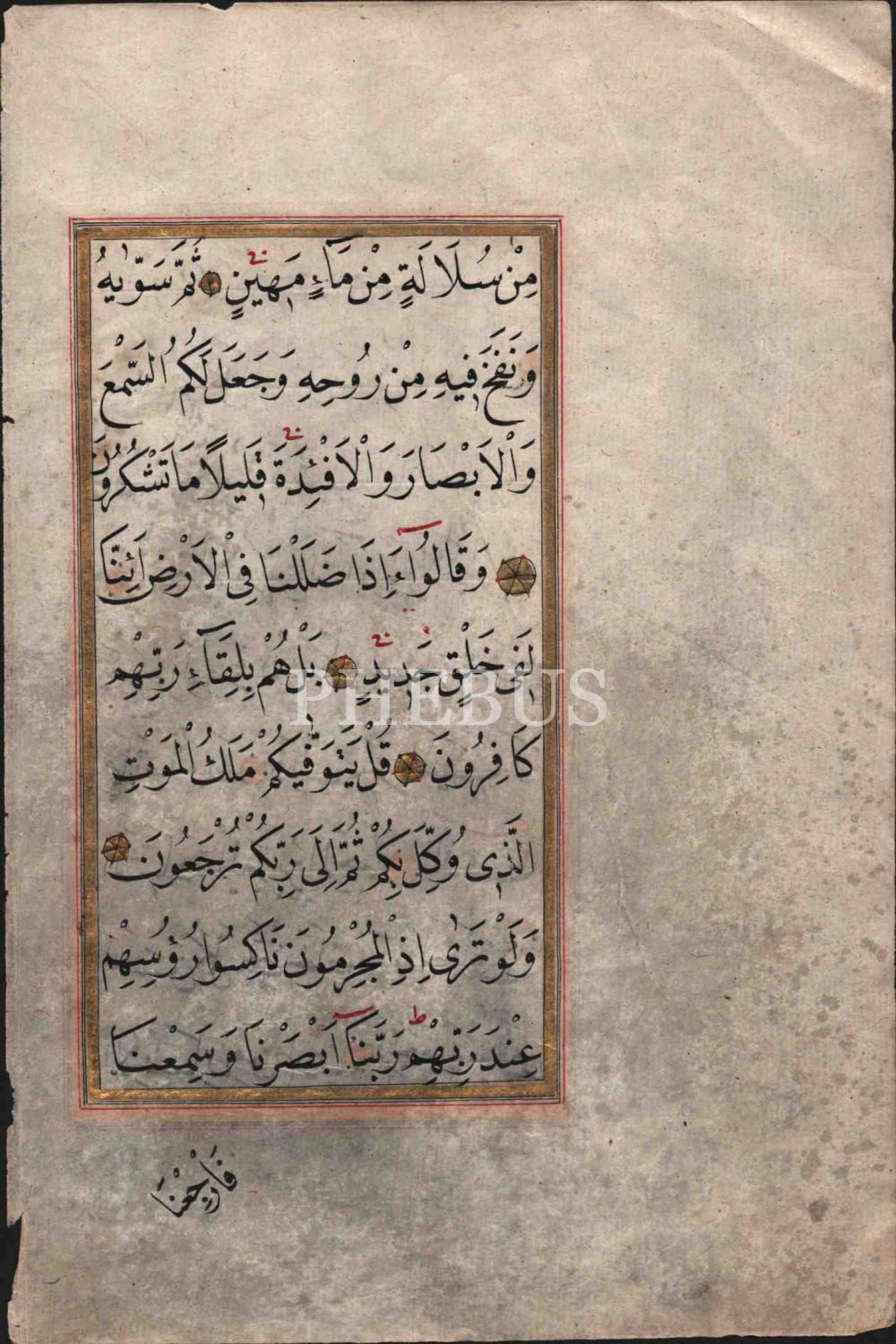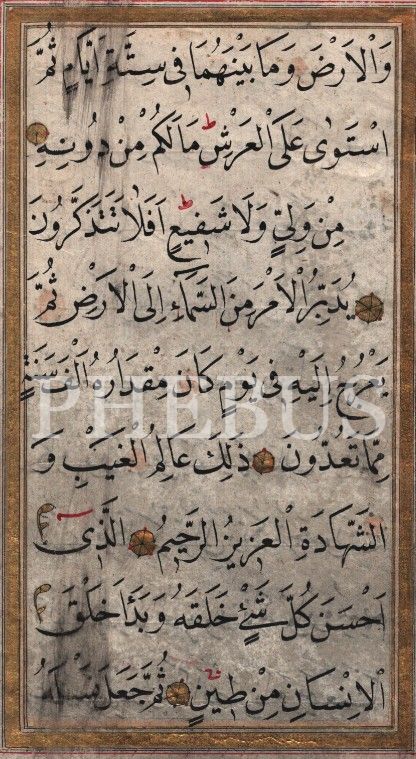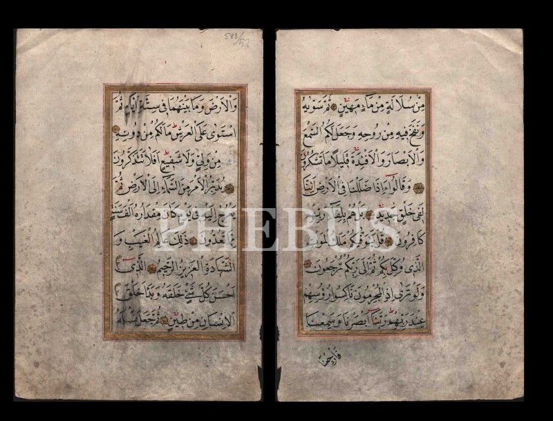 Nesih yazı ile Secde Suresinden önlü-arkalı iki sayfa, altın cetvelli, 11x19 cm