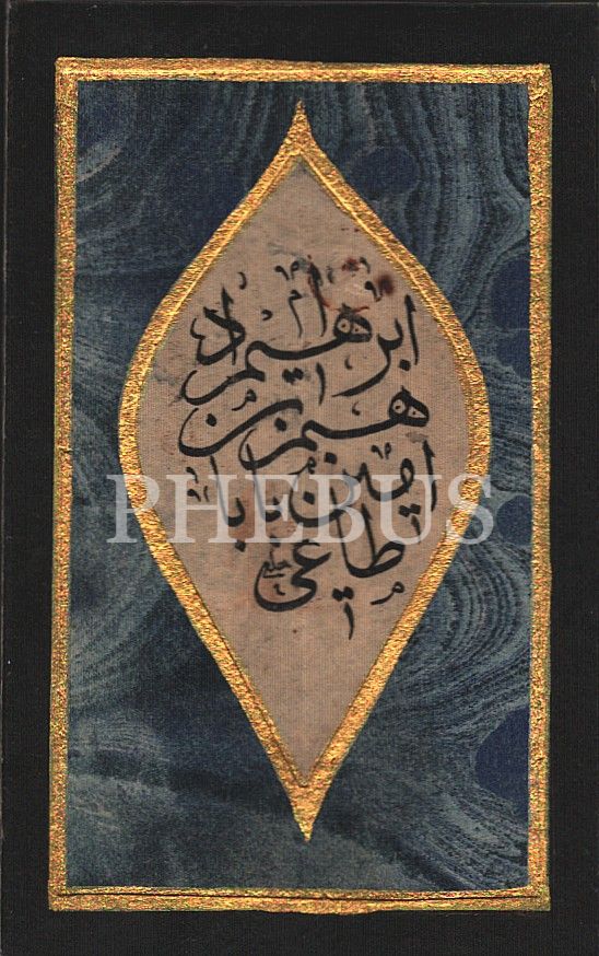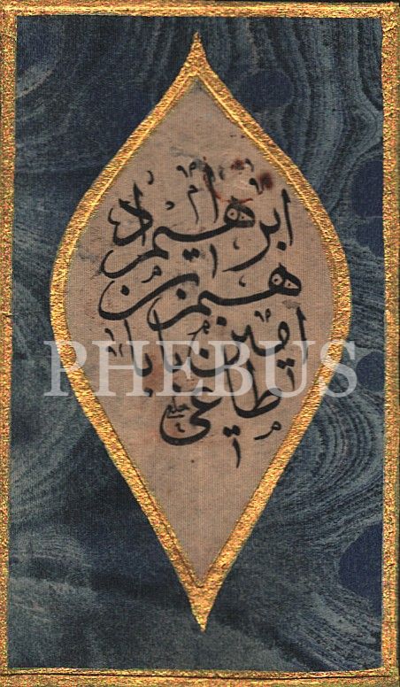 Şemse formunda ebru pervazlı ve Hilmi ketebeli nesih yazı: "İbrahim Edhem b. Emin Babadağî", 7x11 cm