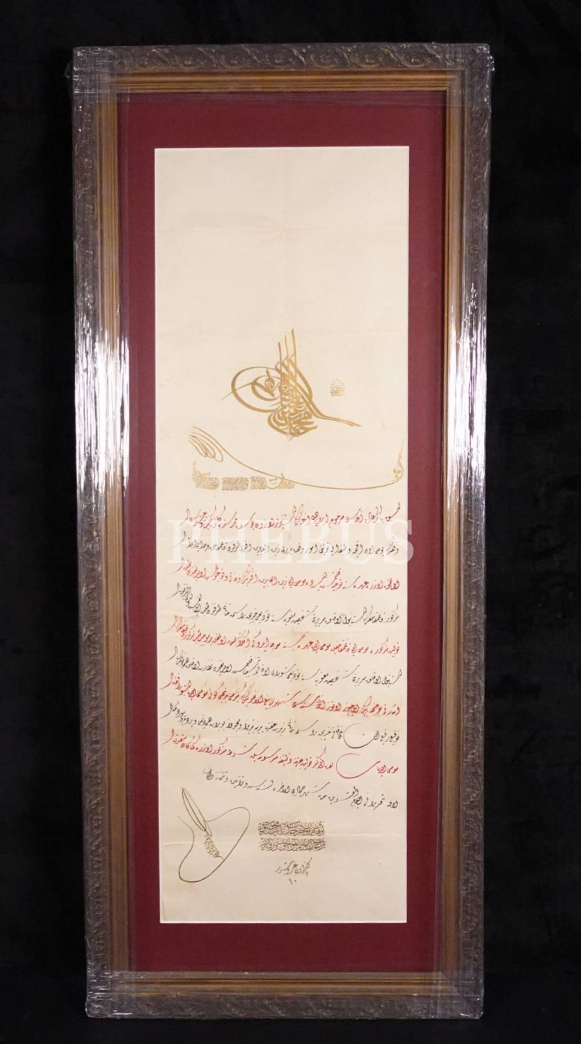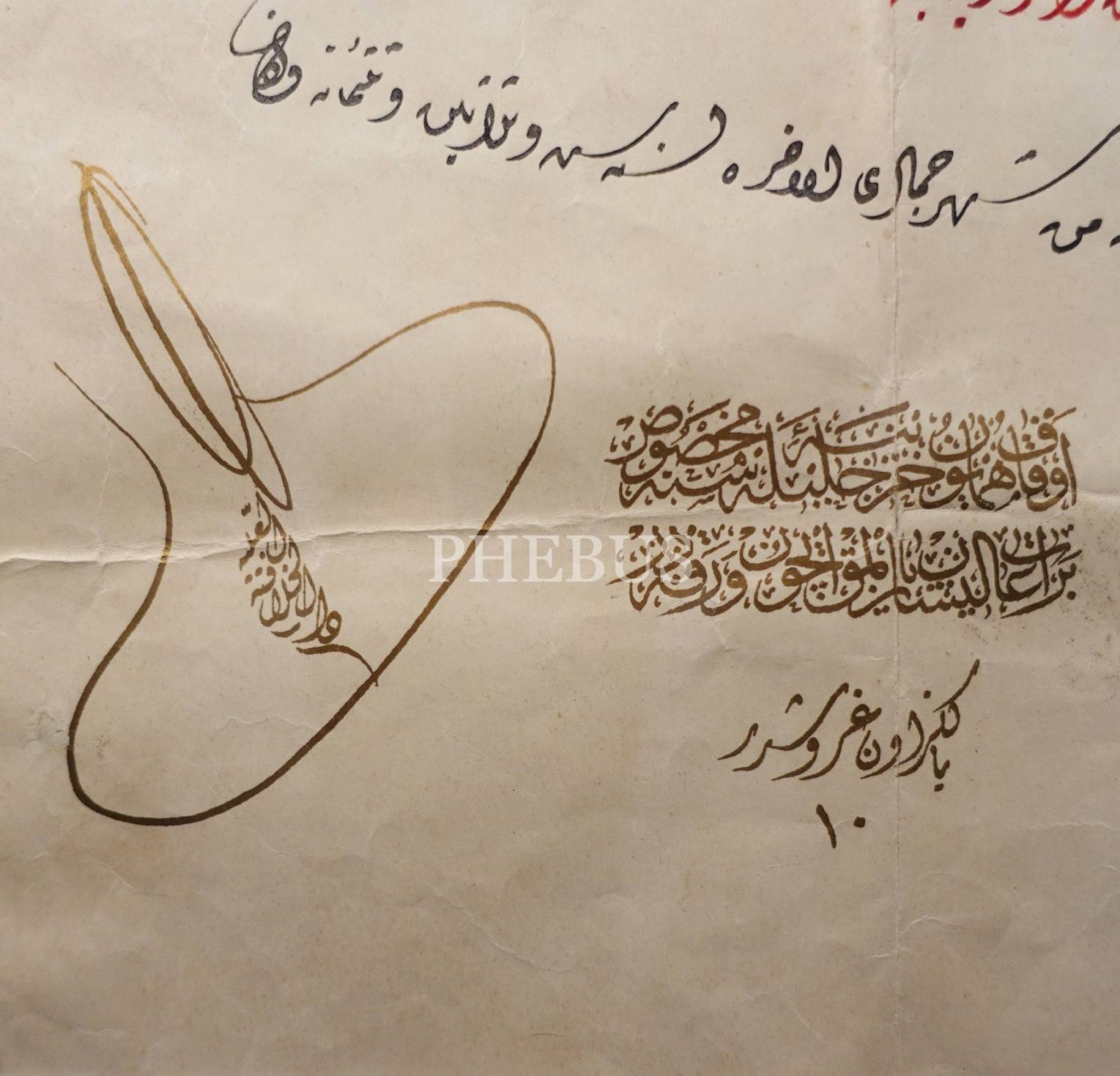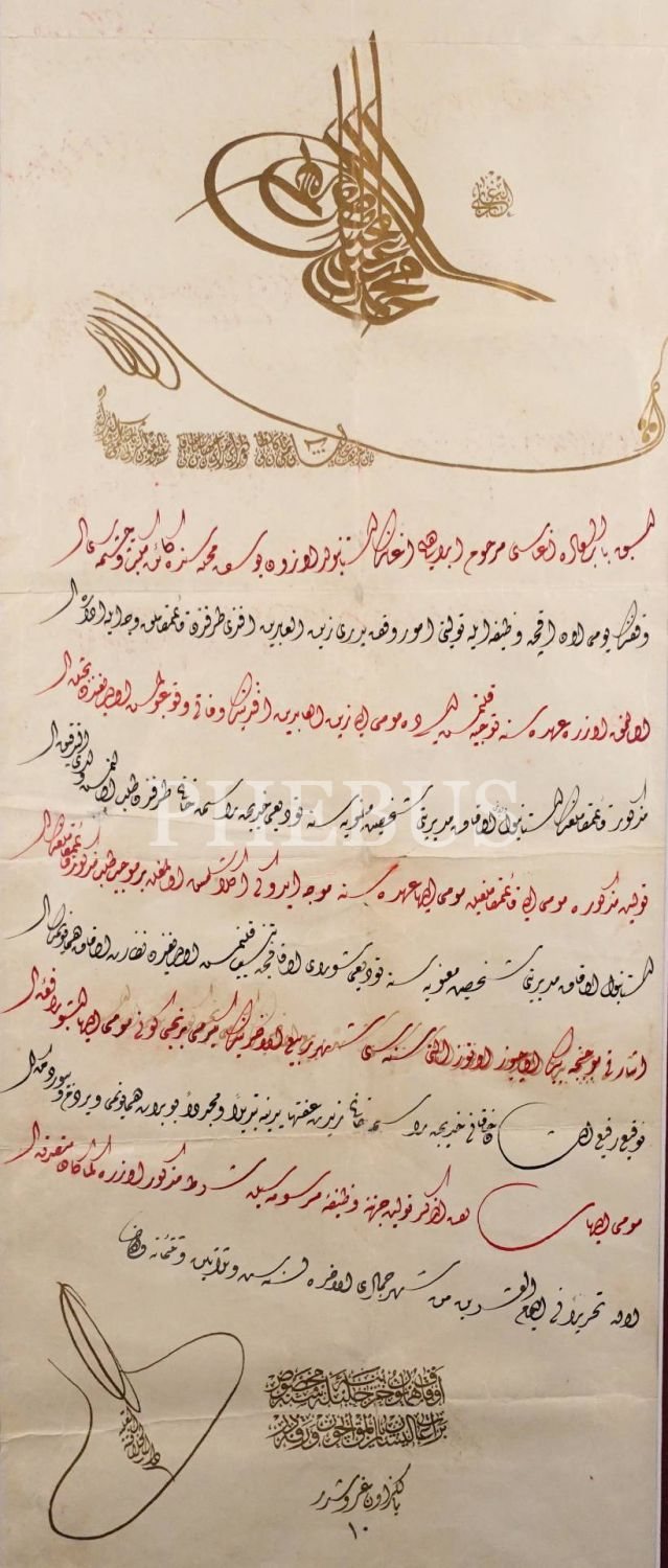Bâbüssâade Ağası İbrahim Ağa´nın İstanbul´daki mektep ve çeşme vakfının tevliyetine dair Sultan II. Abdülhamid tuğralı ve 1336 tarihli berat, 40x97 cm