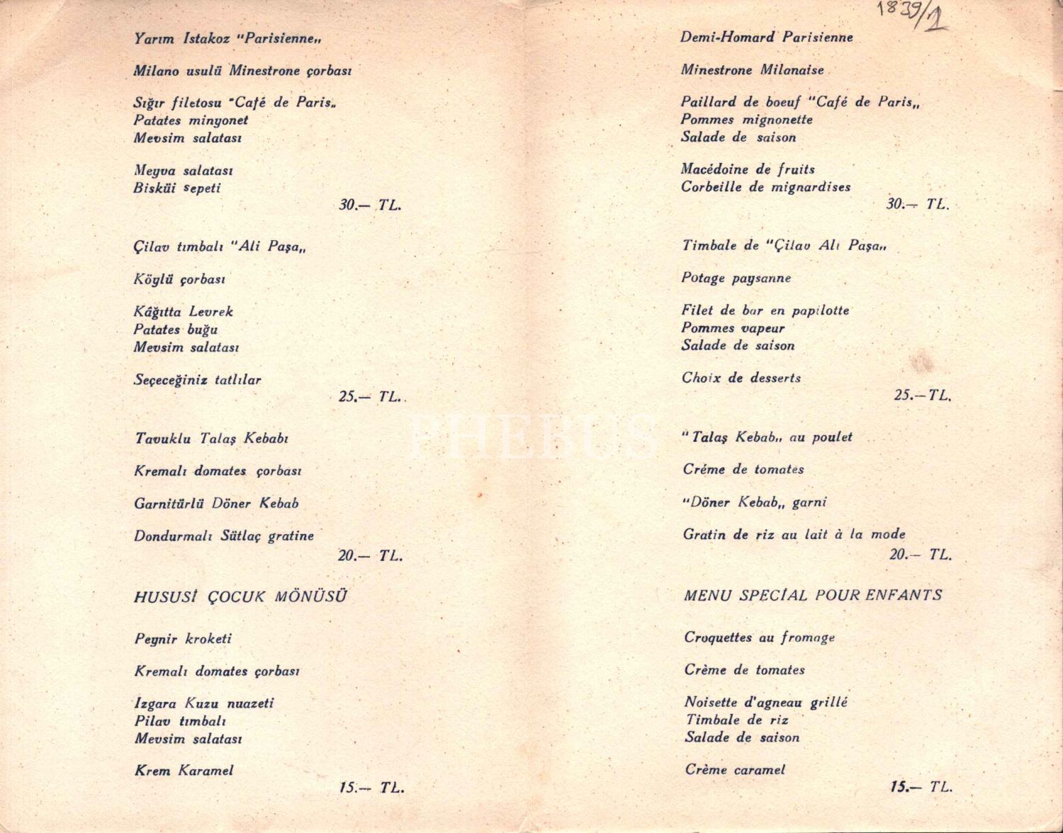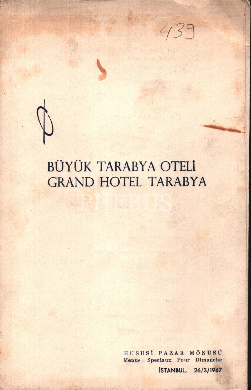 26 Mart 1967 tarihli Büyük Tarabya Oteli Hususi Pazar Mönüsü, Fransızca-Türkçe, 14x22 cm