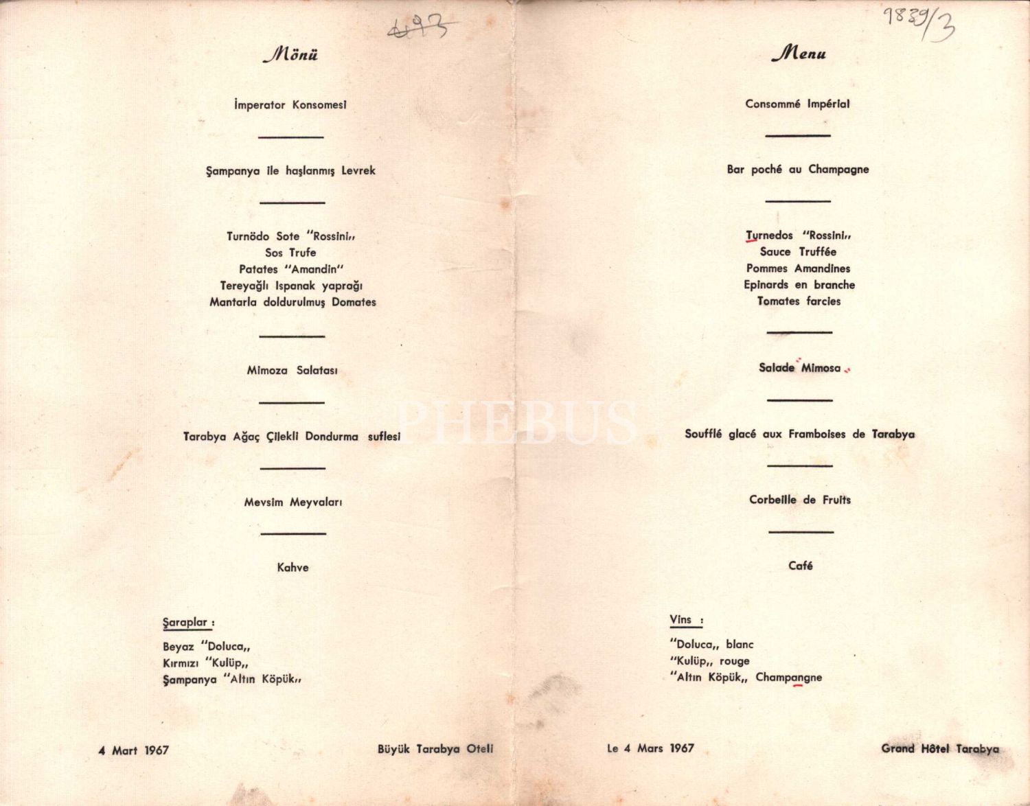 4 Mart 1967 tarihli Büyük Tarabya Oteli mönüsü, Fransızca-Türkçe, 14x22 cm