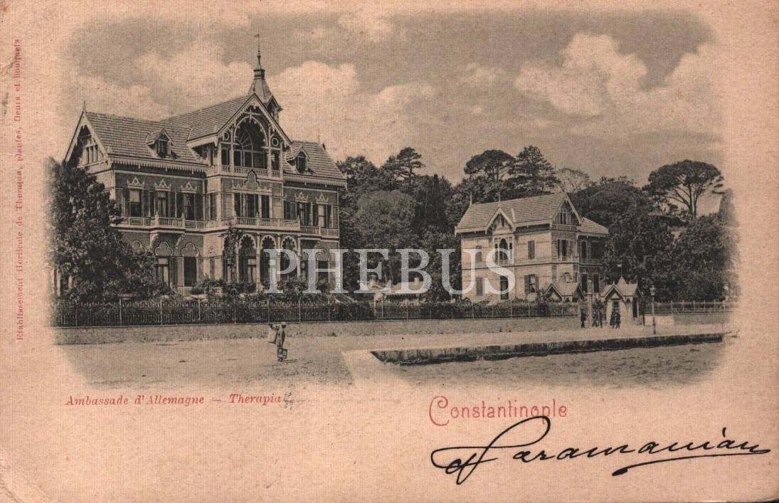 Alman Elçiliği Yazlık Sarayı, Tarabya - Constantinople, ed. Etablissement Horticole de Thrapia [Tarabya Fidanlığı], postadan geçmiş, sol üst köşesi yıpranmış haliyle