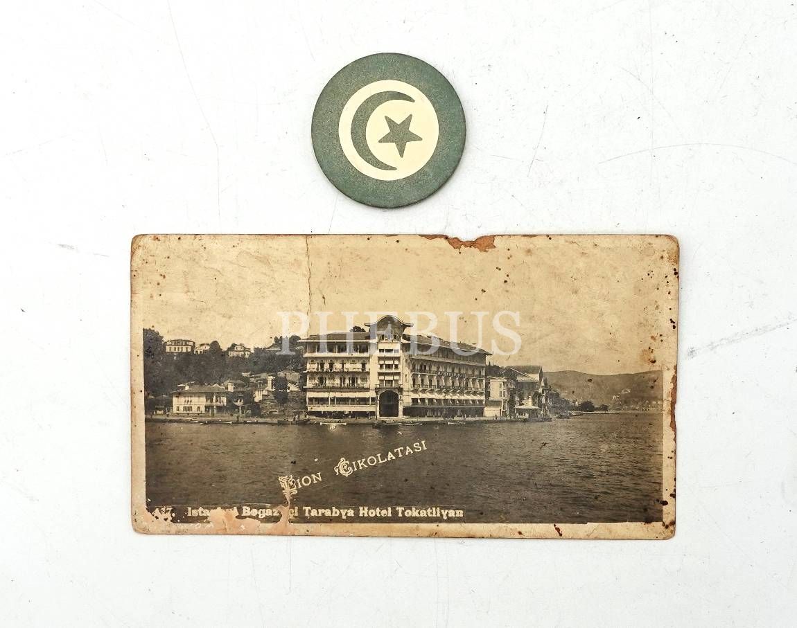Tokatlıyan Oteli kumarhane jetonu ve Lion Çikolatası tarafından bastırılan Tokatlıyan Oteli çikolata kartı, jeton çapı 4 cm