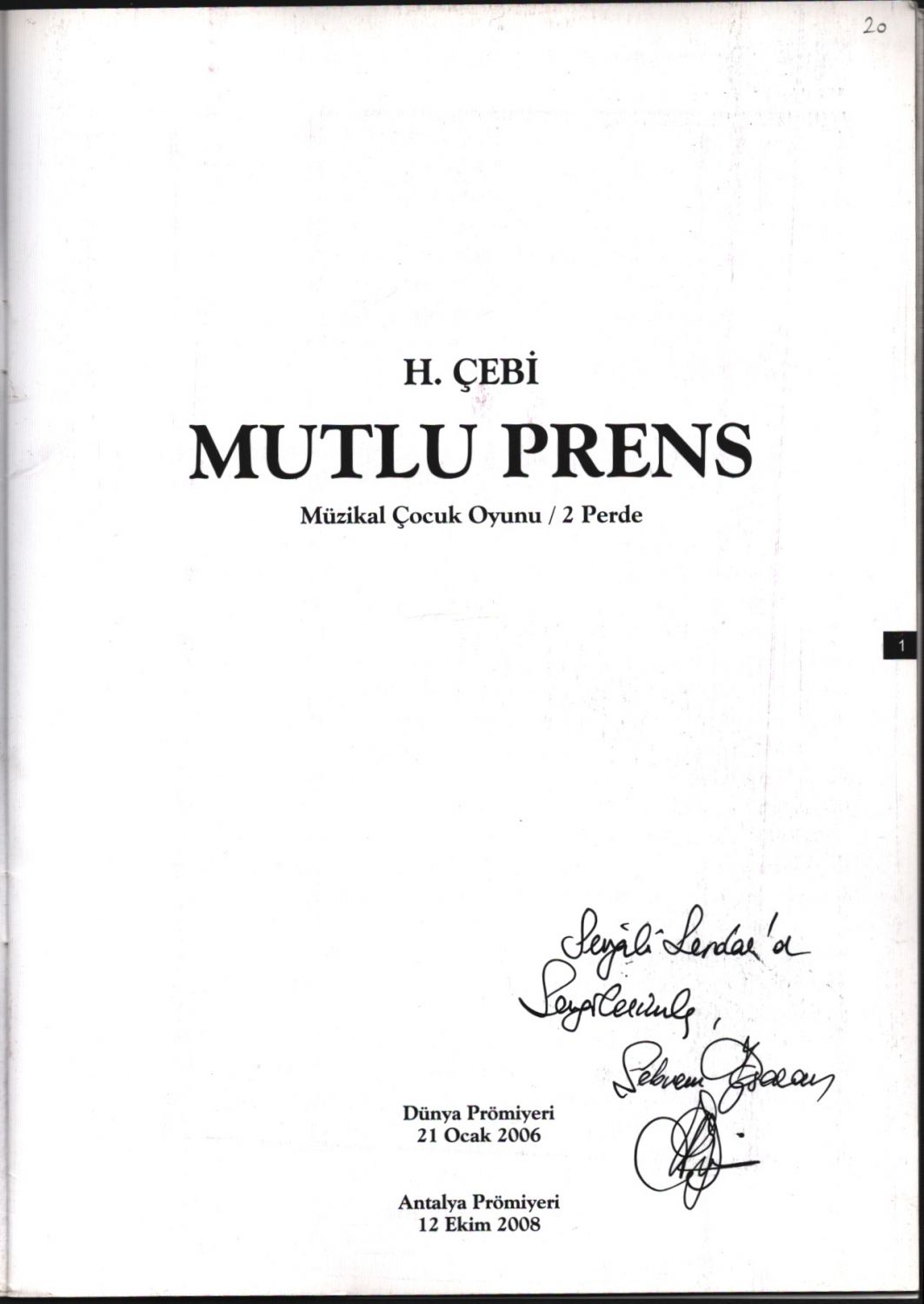MUTLU PRENS (Müzikal Çocuk Oyunu - 2 Perde), H. Çebi, Şebnem Özsaran´dan ithaflı ve imzalı, Antalya Devlet Opera ve Balesi, 2008, 17 sayfa, 16x23 cm