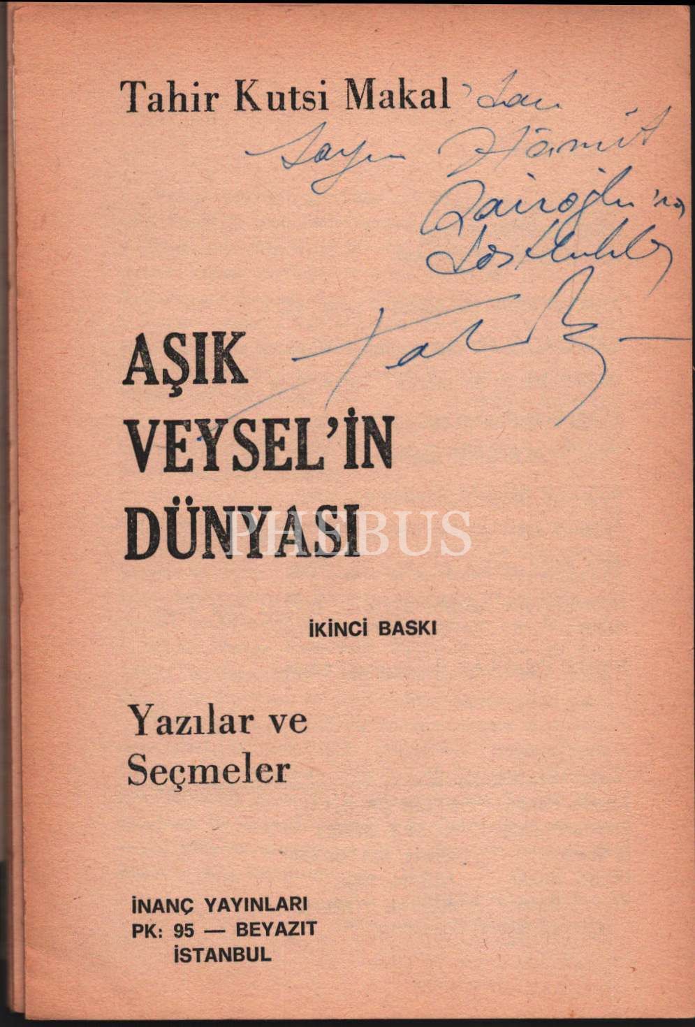 AŞIK VEYSEL´İN DÜNYASI - Yazılar ve Seçmeler, Tahir Kutsi Makal´dan ithaflı ve imzalı, İnanç Yayınları, 95 sayfa, 13x19 cm, sırtı haliyle