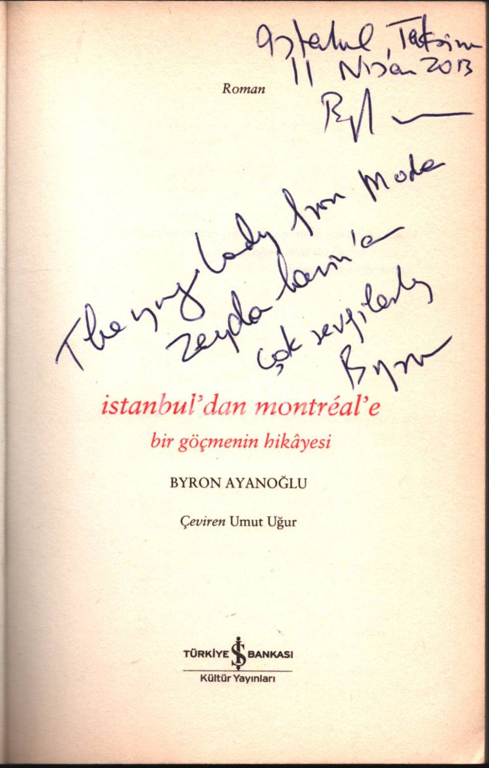 İSTANBUL´DAN MONTREAL´E Bir Göçmenin Hikâyesi, Byron Ayanoğlu´ndan ithaflı ve imzalı, çev. Umut Uğur, Türkiye İş Bankası Kültür Yayınları, İstanbul - Nisan 2013, 361 sayfa, 13x20 cm