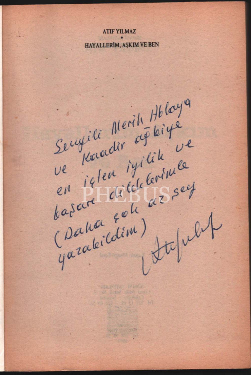 İthaf, "Sevgili Merih Ablaya ve Kaadir ağbiye en içten iyilik ve başarı dileklerimle (Daha çok az şey yazabildim) Atıf Yılmaz" şeklindedir.