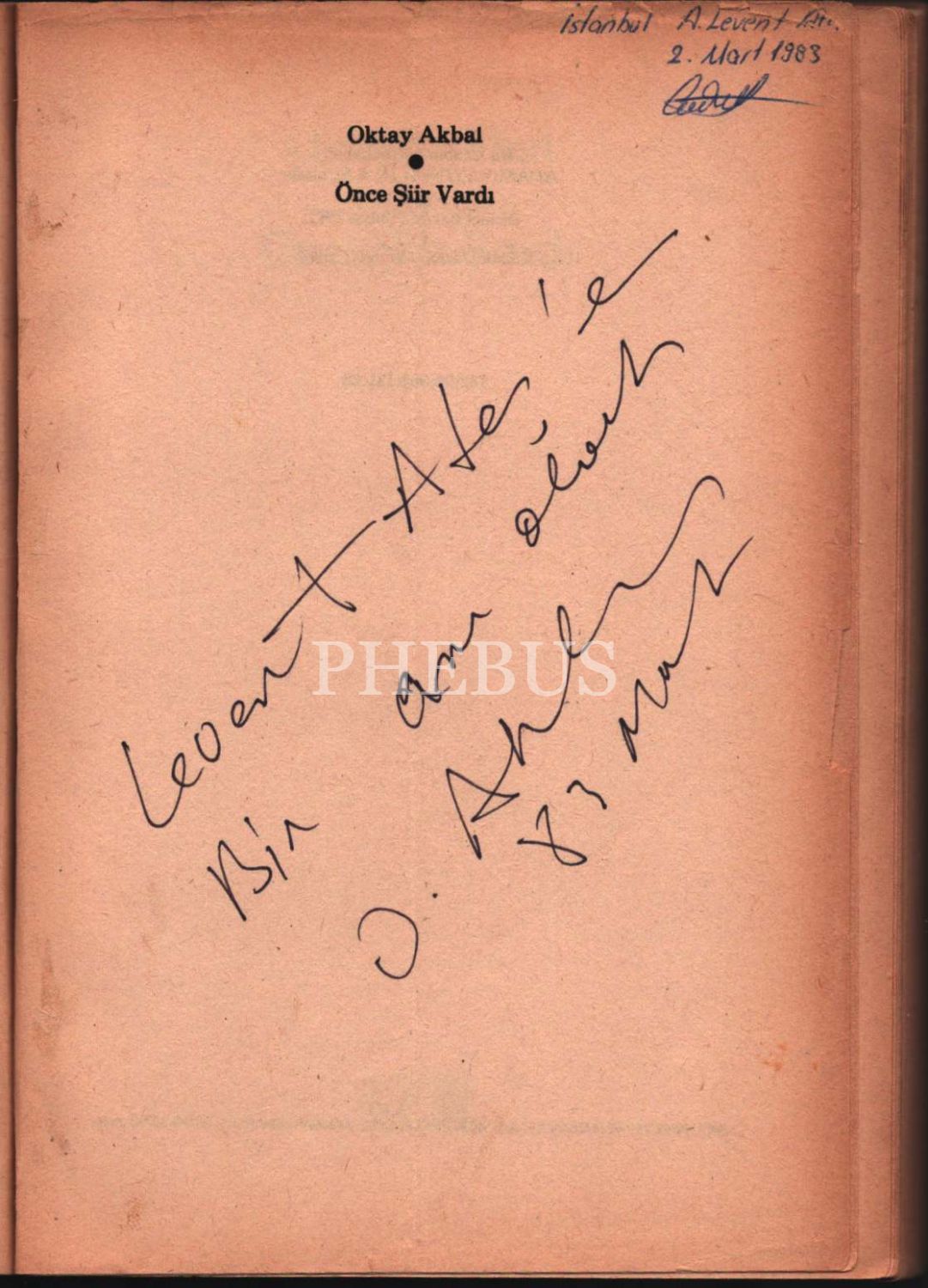 İthaf, "Levent Ateş´e Bir anı olarak O. Akbal 83 Mart" şeklindedir.