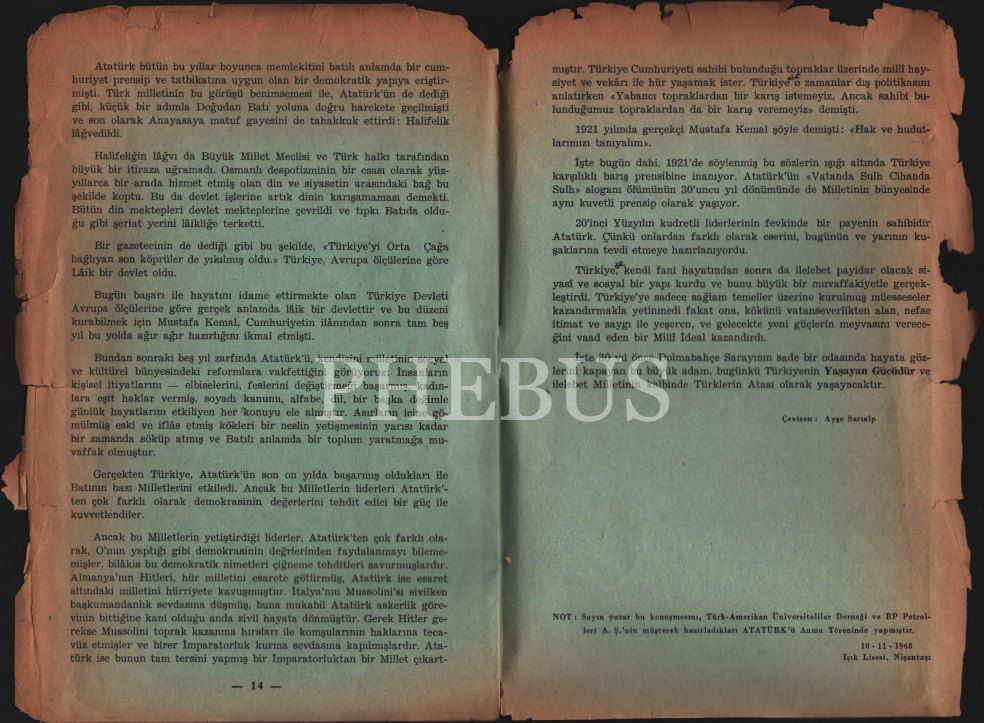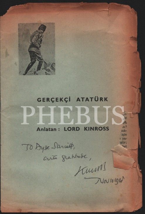 GERÇEKÇİ ATATÜRK, Lord Kinross´tan ithaflı ve imzalı, Hünkâr Basımevi, İstanbul, 15 sayfa, 16x25 cm, epey yıpranmış haliyle