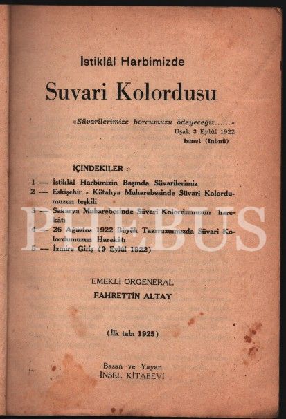 İstiklâl Harbimizde SUVARİ KOLORDUSU, Fahrettin Altay´dan ithaflı ve imzalı, İnsel Kitabevi, 77 sayfa + harita ekleri, 14x20 cm