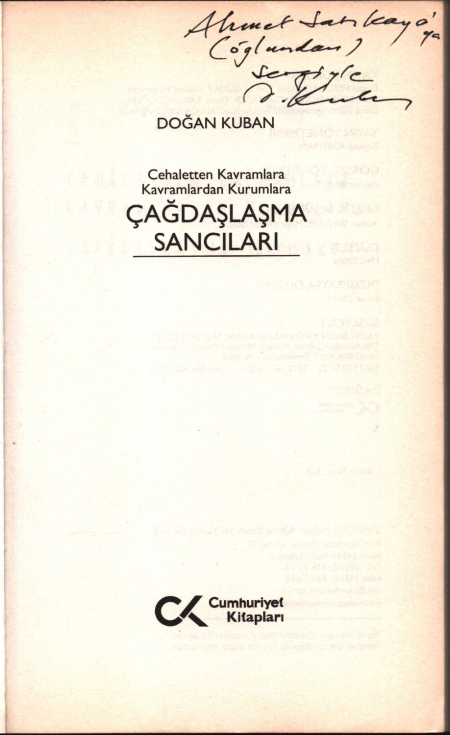 Cehaletten Kavramlara Kavramlardan Kurumlara ÇAĞDAŞLAŞMA SANCILARI, Doğan Kuban´dan ithaflı ve imzalı, Cumhuriyet Kitapları, Ekim 2009, 368 sayfa, 14x21 cm