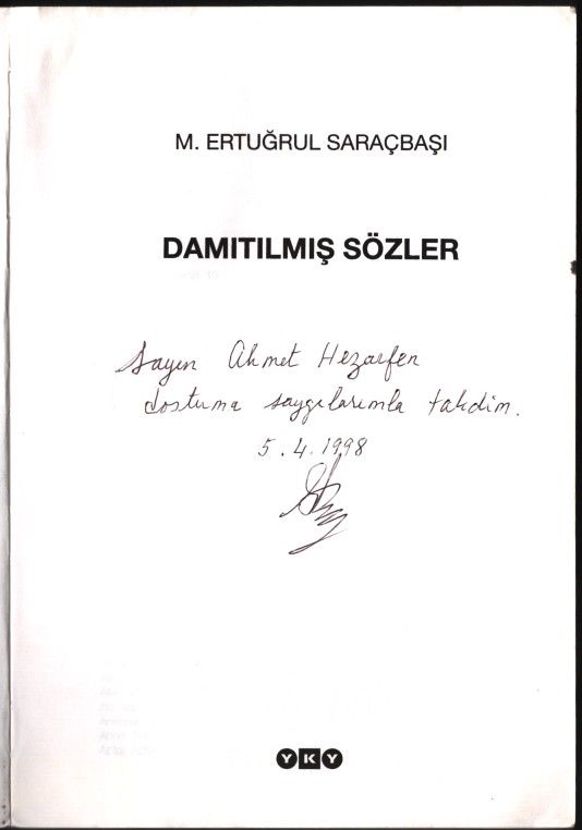 İthaf, "Sayın Ahmet Hezarfen dostuma saygılarımla takdim. 5.4.1998" şeklindedir.