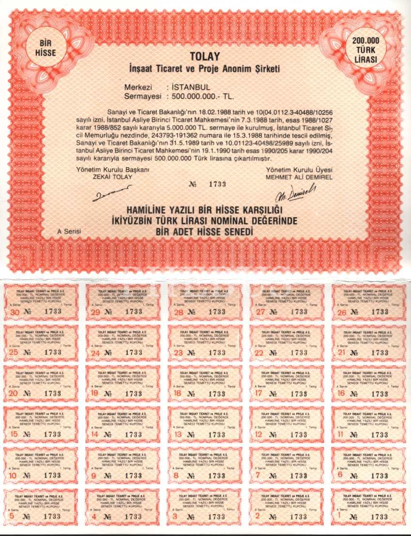 Tolay İnşaat Ticaret ve Proje A.Ş.´ye ait hisse senedi, 24x31 cm