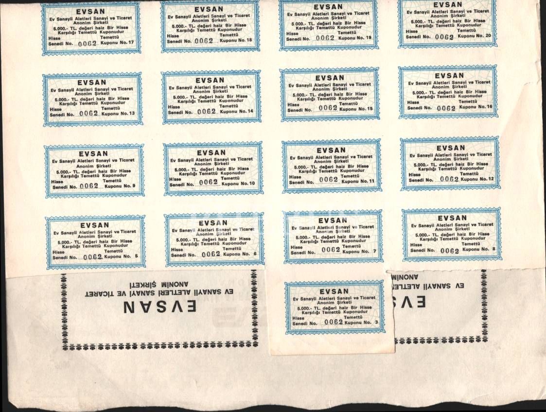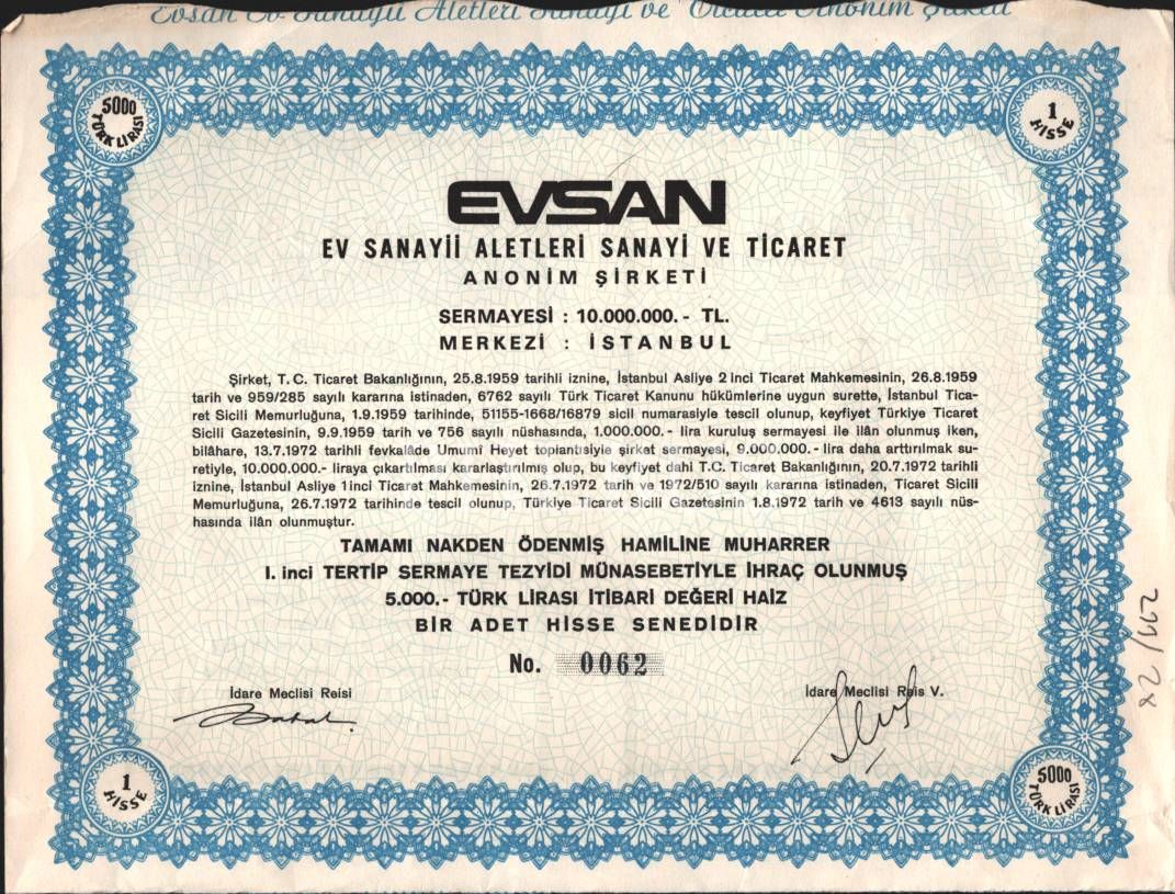 Evsan Ev Sanayii Aletleri Sanayi ve Ticaret A.Ş.´ye ait hisse senedi, 30x42 cm