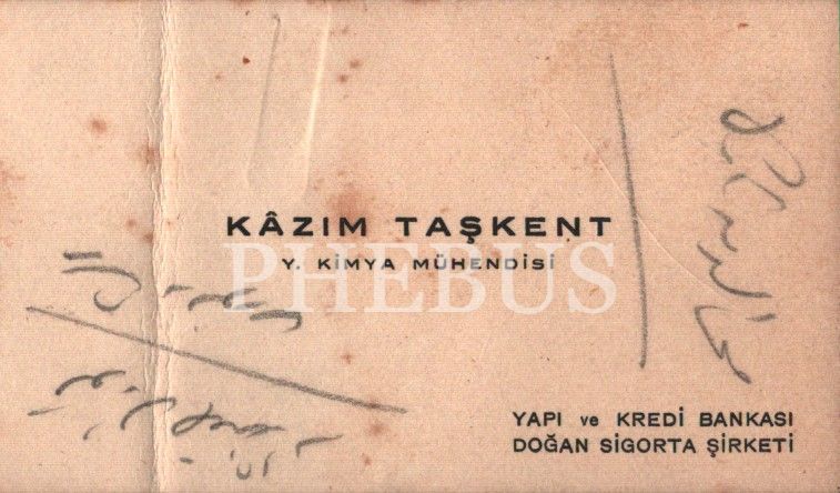 Y. Kimya Mühendisi ve Yapı ve Kredi Bankası´nın kurucusu Kâzım Taşkent´e ait kartvizit, üzerinde Osmanlıca notlar mevcut