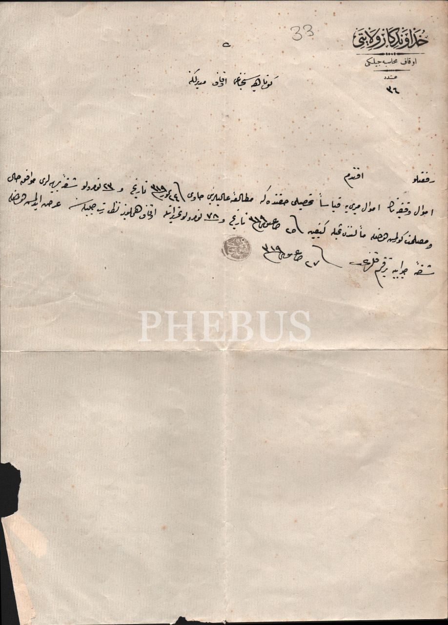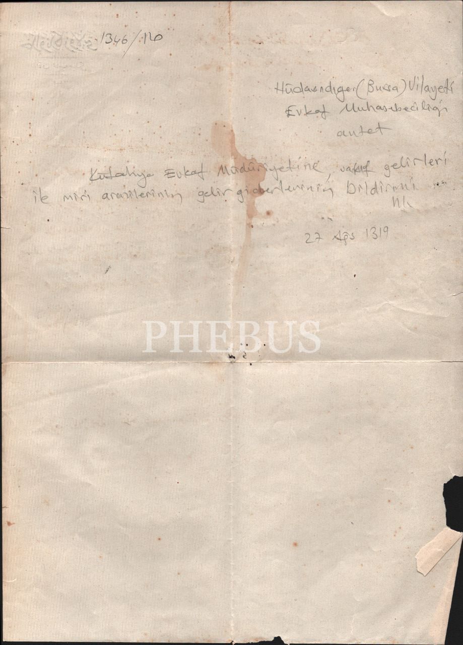 Vakıf gelirleri hakkında Kütahya Evkaf Müdürlüğüne gönderilen 1319 tarihli evrak, 23x32 cm
